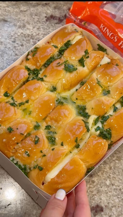 This Hawaiian roll cheesy garlic bread is so easy to make using King’s Hawaiian rolls that are stuffed with mozzarella cheese and baked in garlic butter until golden brown.