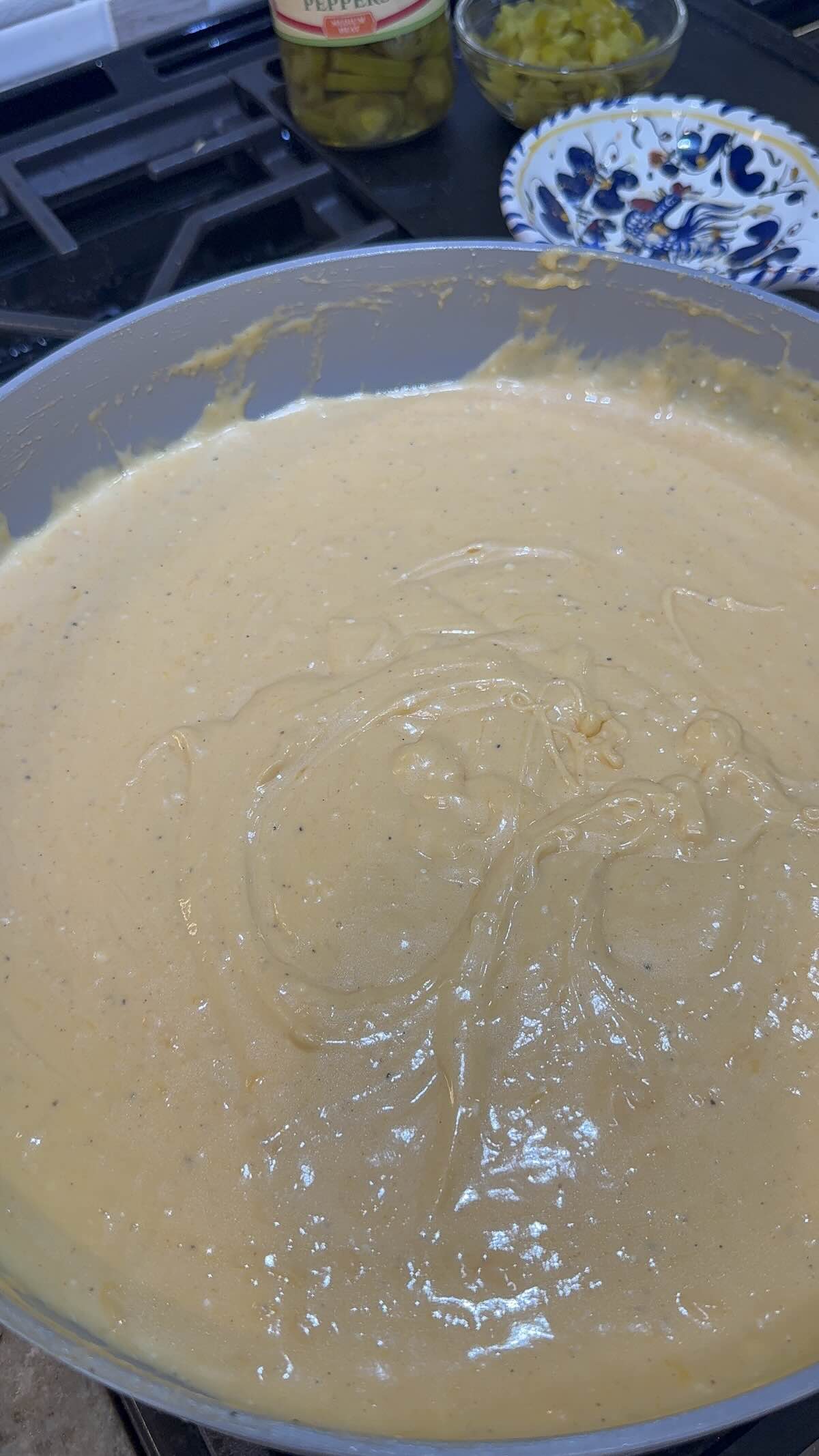 Then, season with garlic powder, onion powder, smoked paprika, salt, and pepper. Lower heat and slowly stir in cheddar and Monterey Jack until silky. Stir in the pickled jalapeños and chopped bacon.
