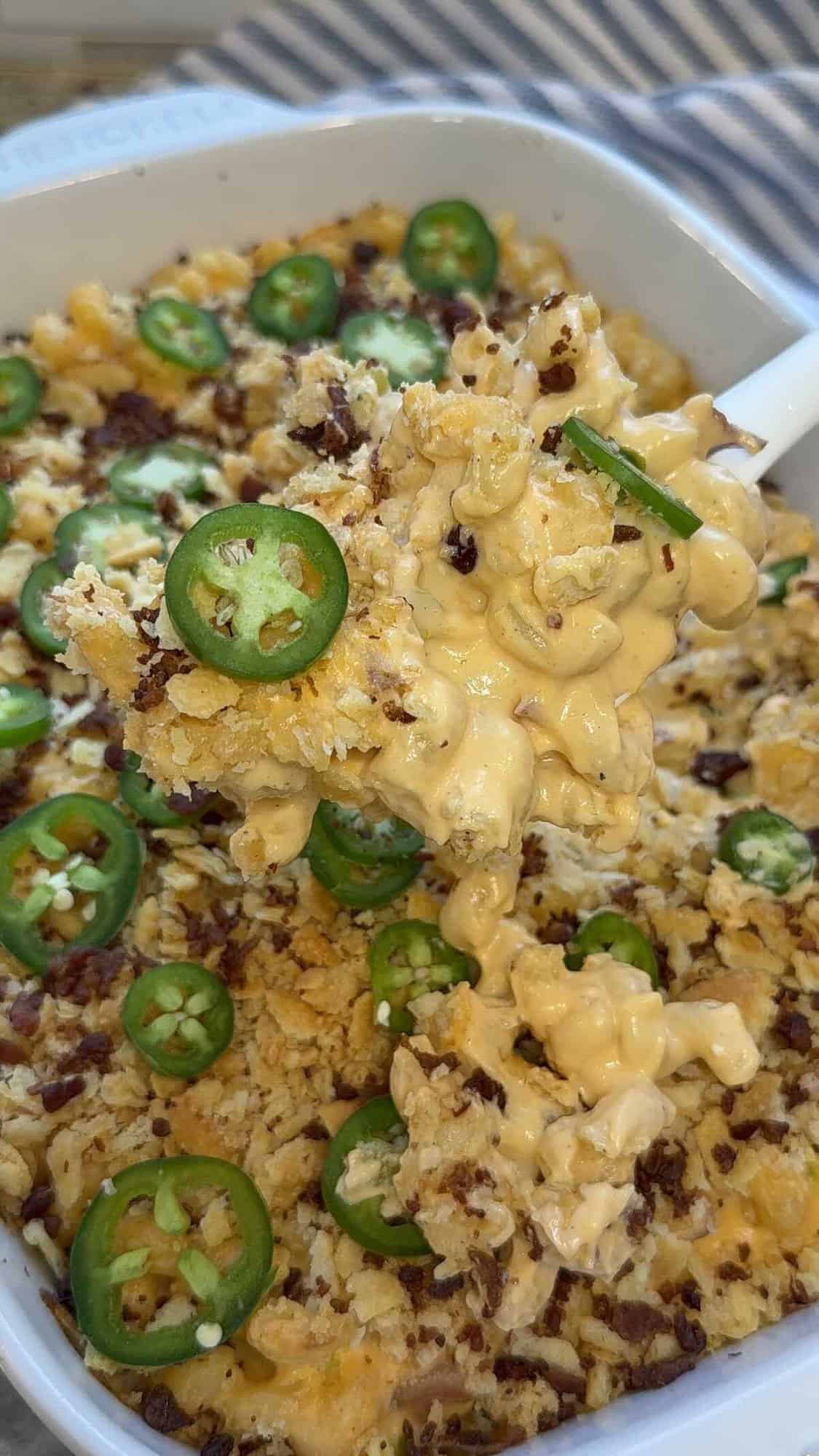 Now, fold in pasta until it’s evenly coated in the sauce. Transfer it to a greased 9 x 13” baking dish and sprinkle on the Ritz cracker topping. Place it into the center rack of the oven for 20-25 minutes or until the sides are hot and bubbly and the topping is lightly golden. Let it rest for 5 minutes, garnish with additional bacon bits and sliced jalapeños and enjoy.