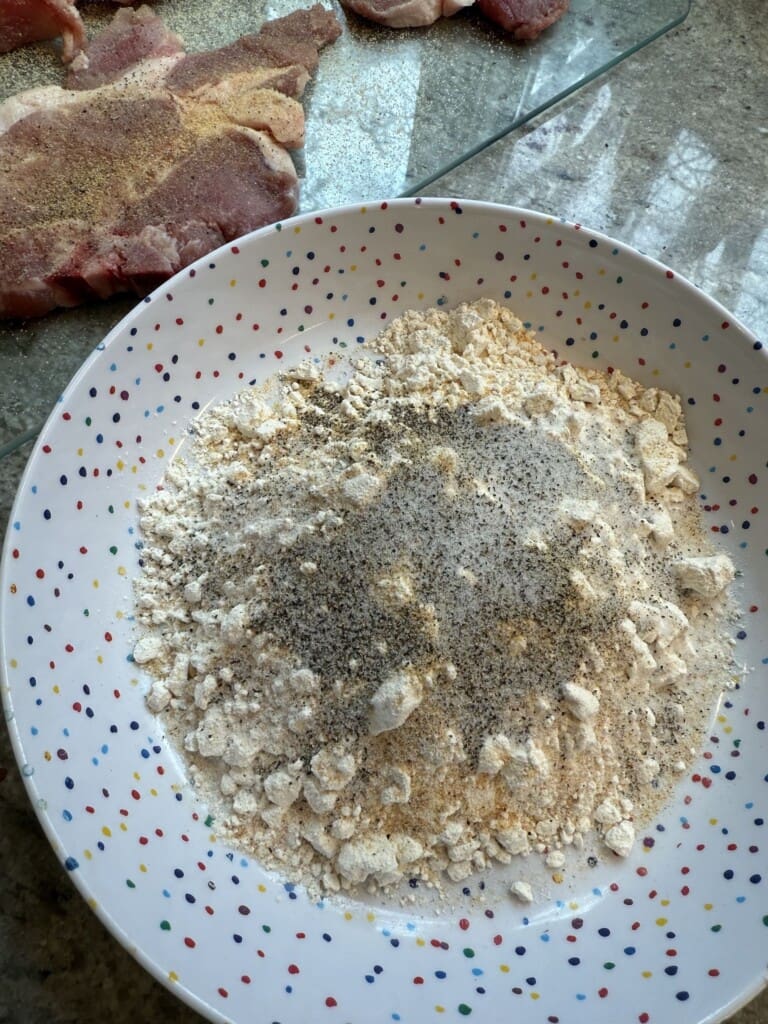 Then, working in batches, dip the pork chops into the flour and coat them on both sides. Shake off any extra flour from the pork chops.