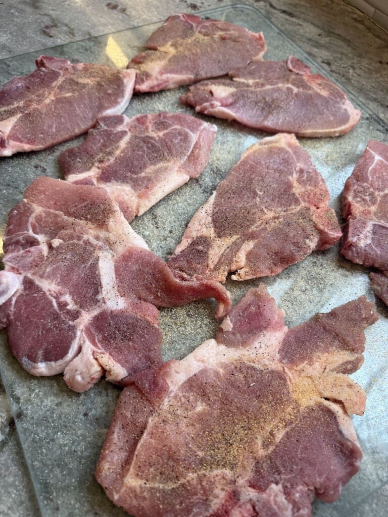 - Pat the pork chops dry with a paper towel and season them with salt, pepper and half of the garlic powder on both sides.