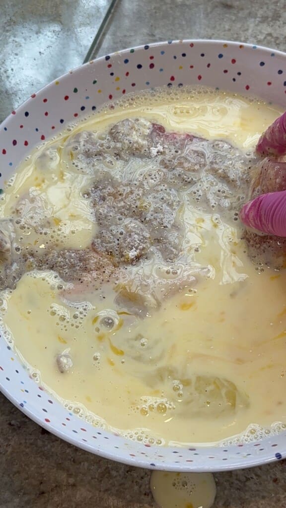 - Take each pork chop and dip them in the flour (be sure to let the extra shake off) then into the egg wash (let the extra egg wash run off) and then into the bread crumbs. Shake the extra bread crumbs off also.
