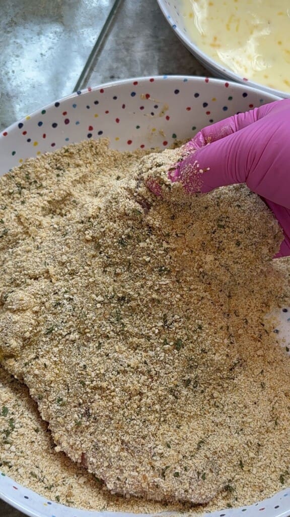 - In a third shallow bowl, add the seasoned breadcrumbs.
