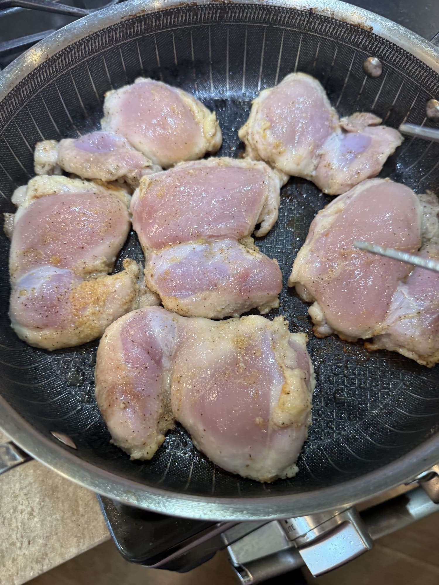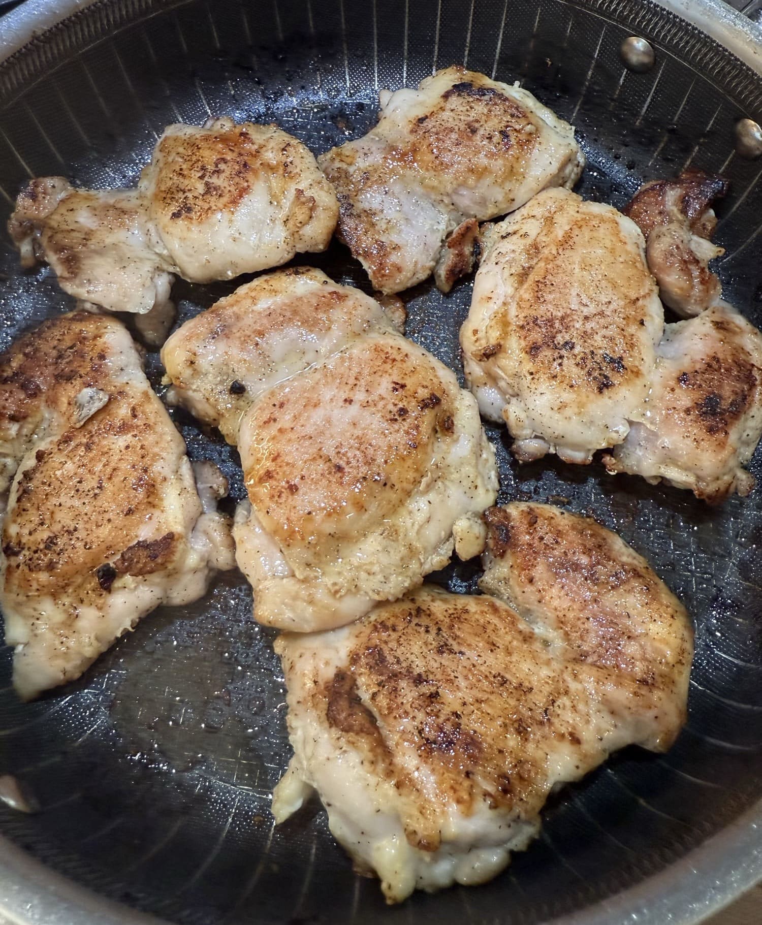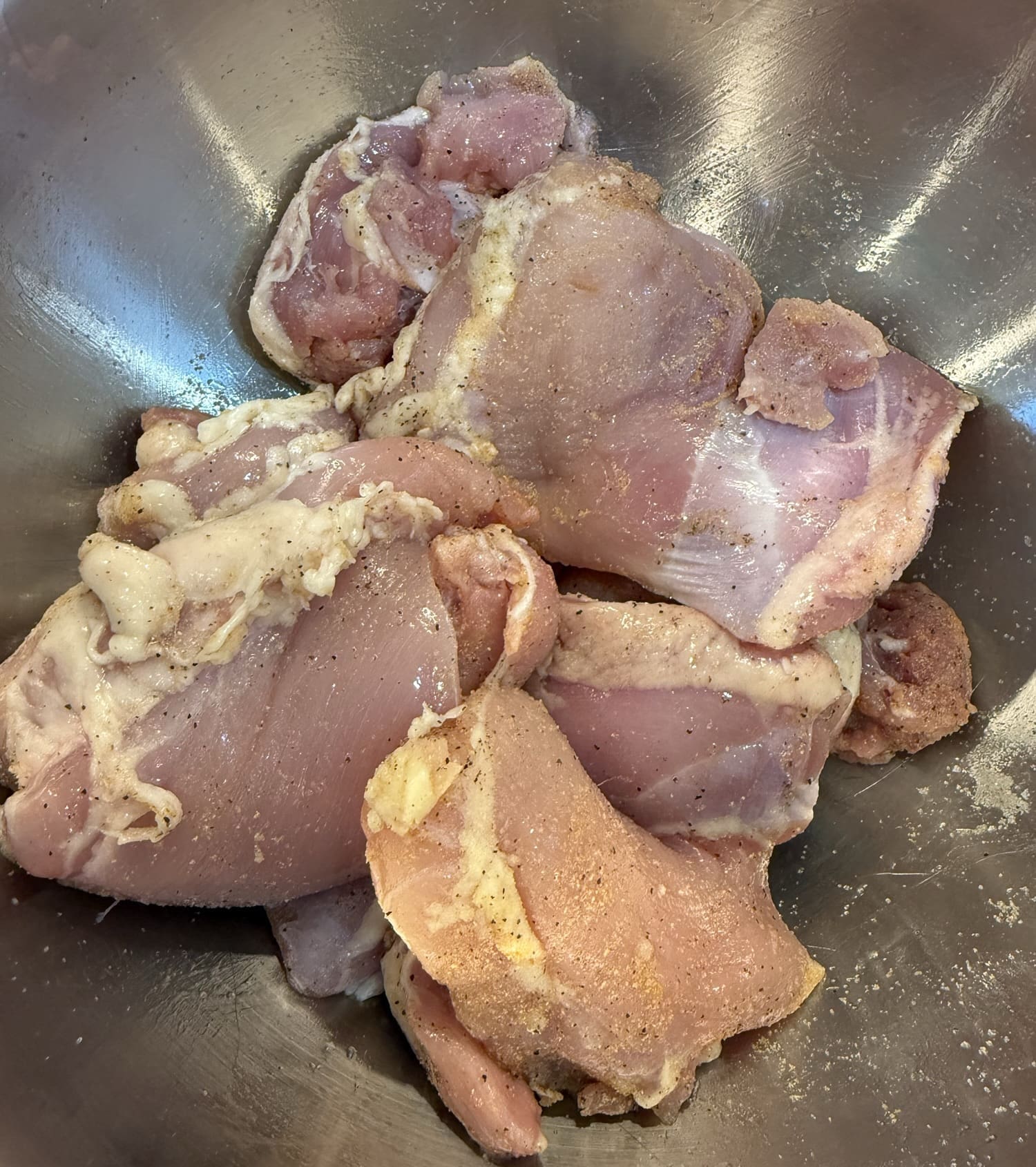 - Season the chicken thighs on both sides with salt, pepper and garlic powder.
