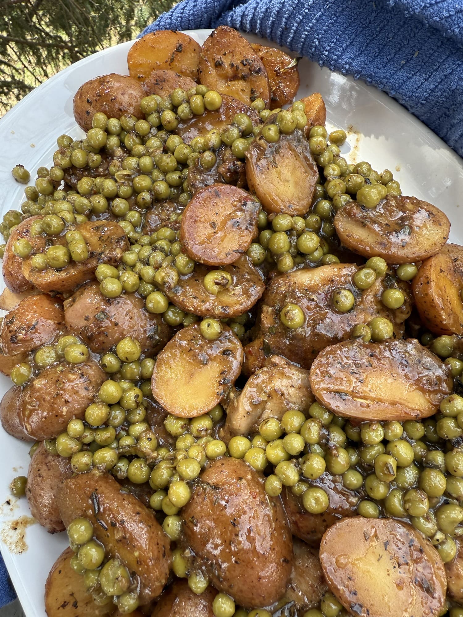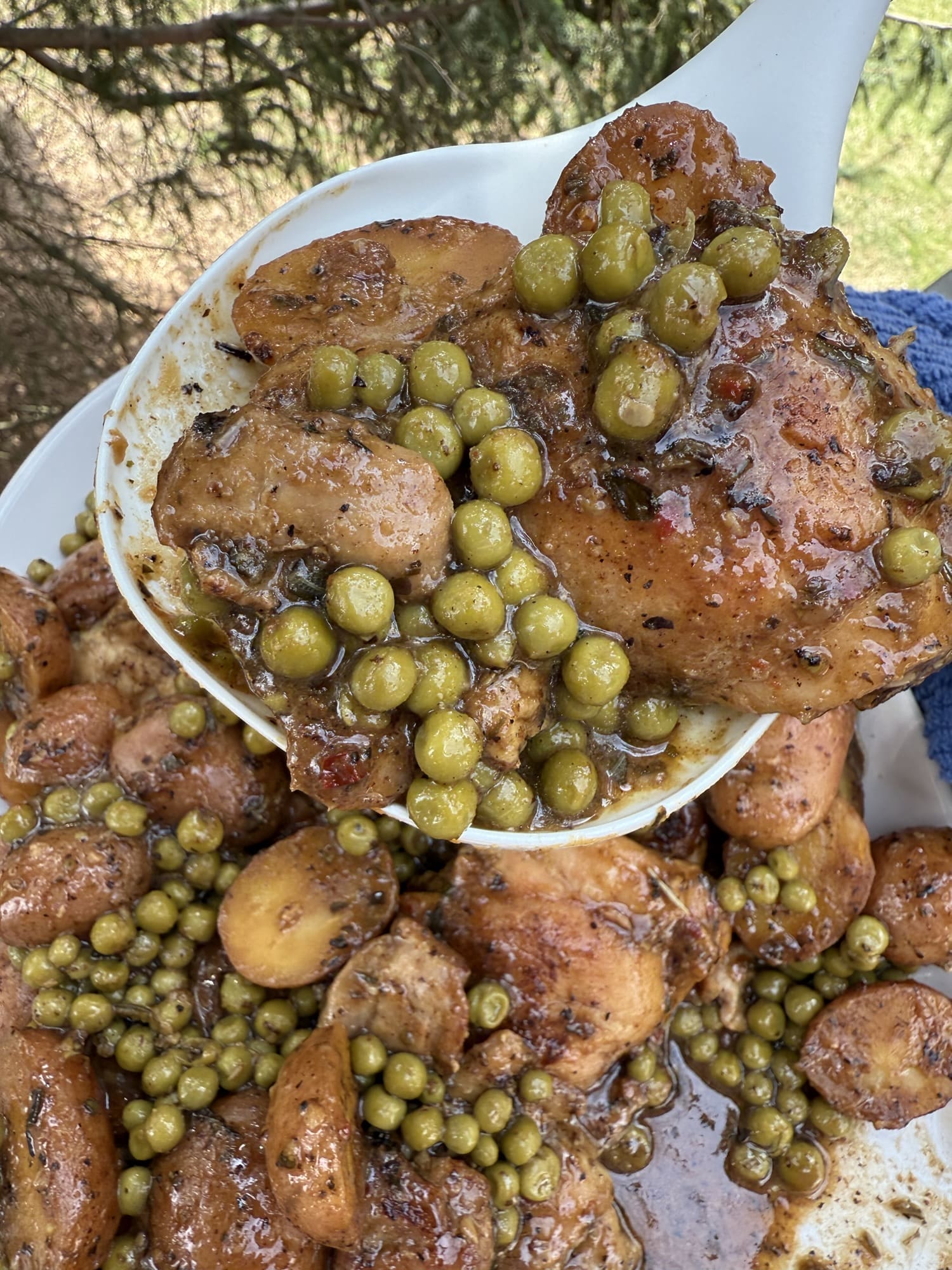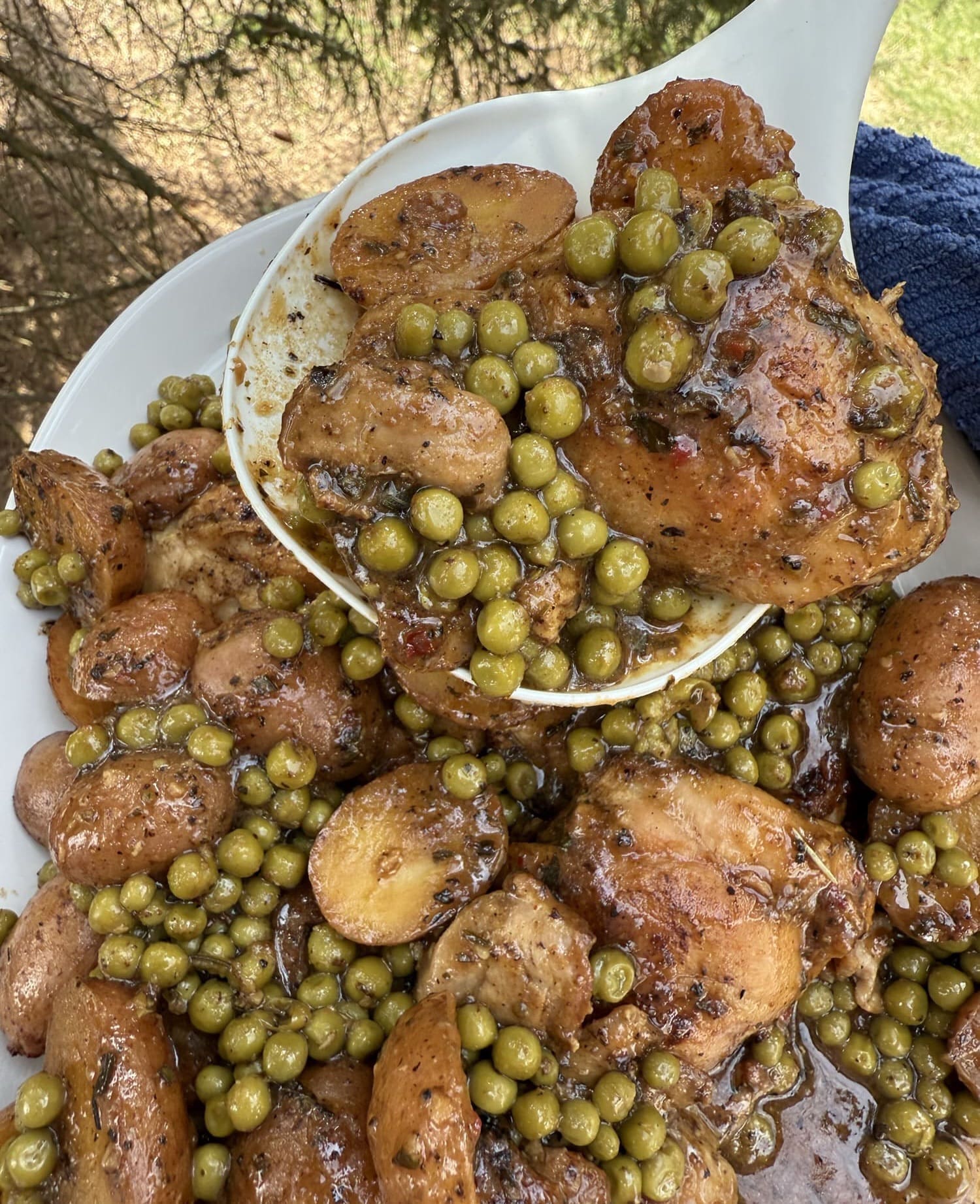 - Spoon the sauce and peas over the chicken and potatoes. Serve warm and enjoy!