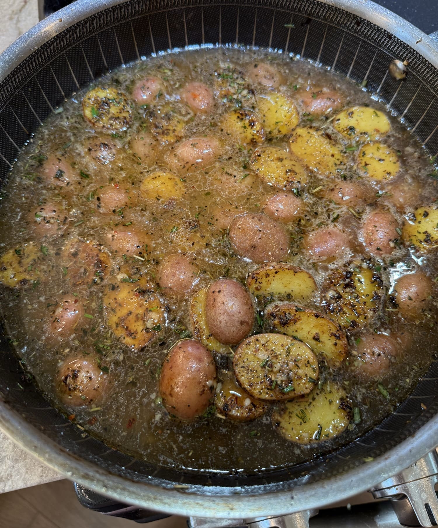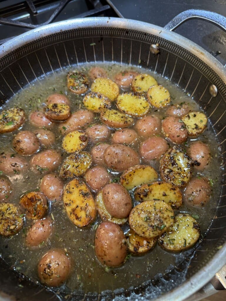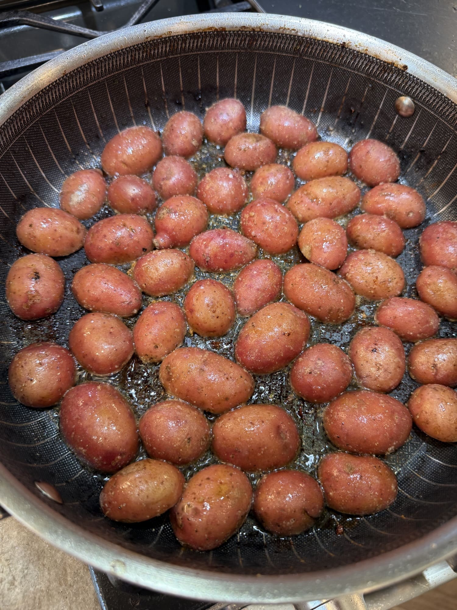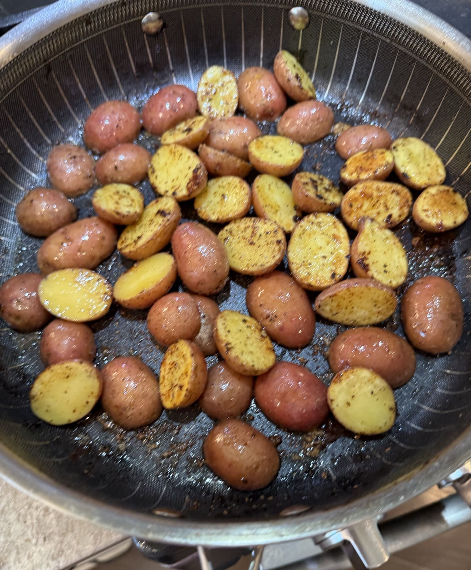Then, add a little more oil to the same skillet and add the potatoes cut side down.