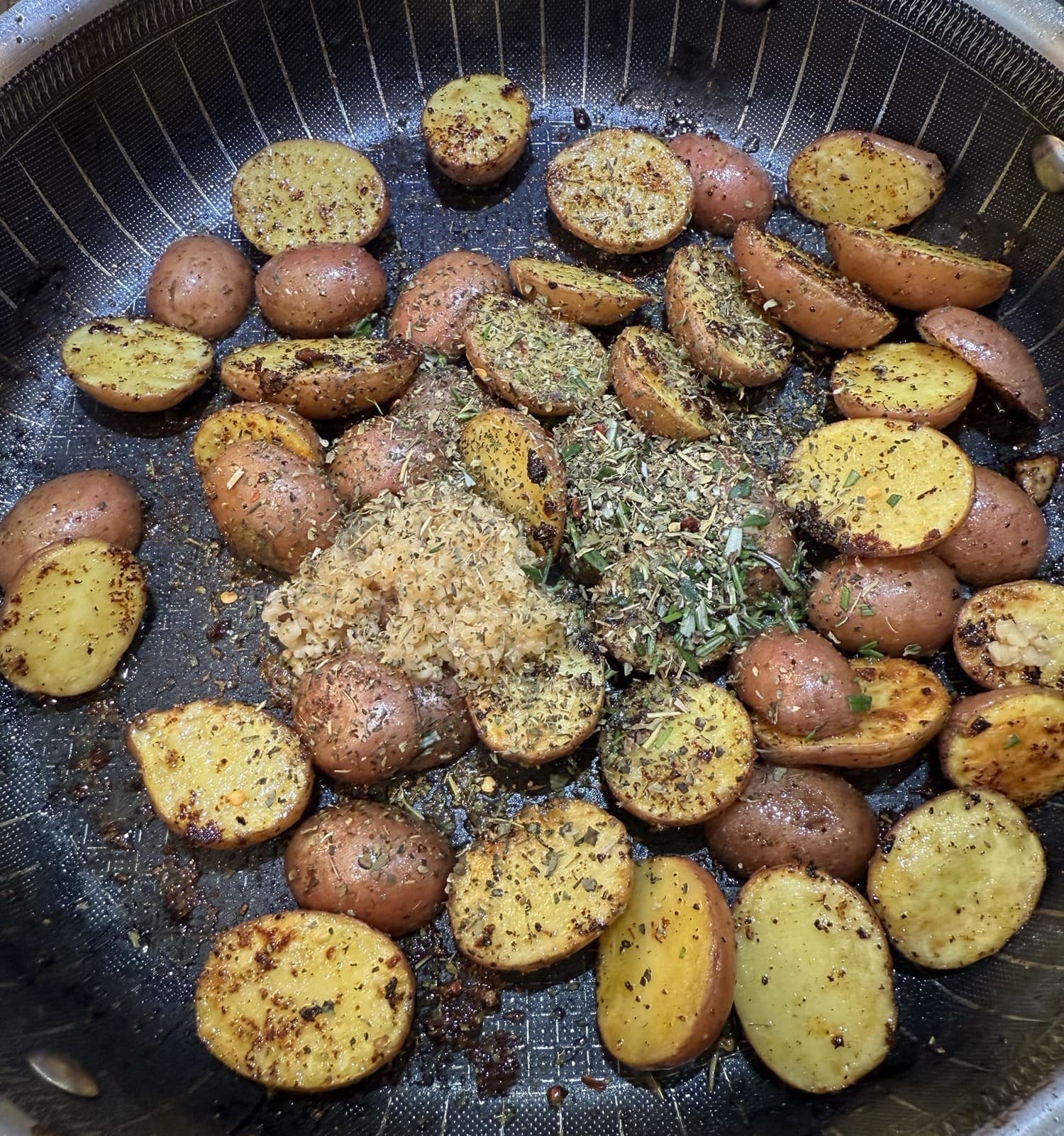 - Add a 1 tbs of oil to the same skillet and add the potatoes cut side down. Season the potatoes with salt and pepper and stir them around for about 7 minutes or until the potatoes are browned.