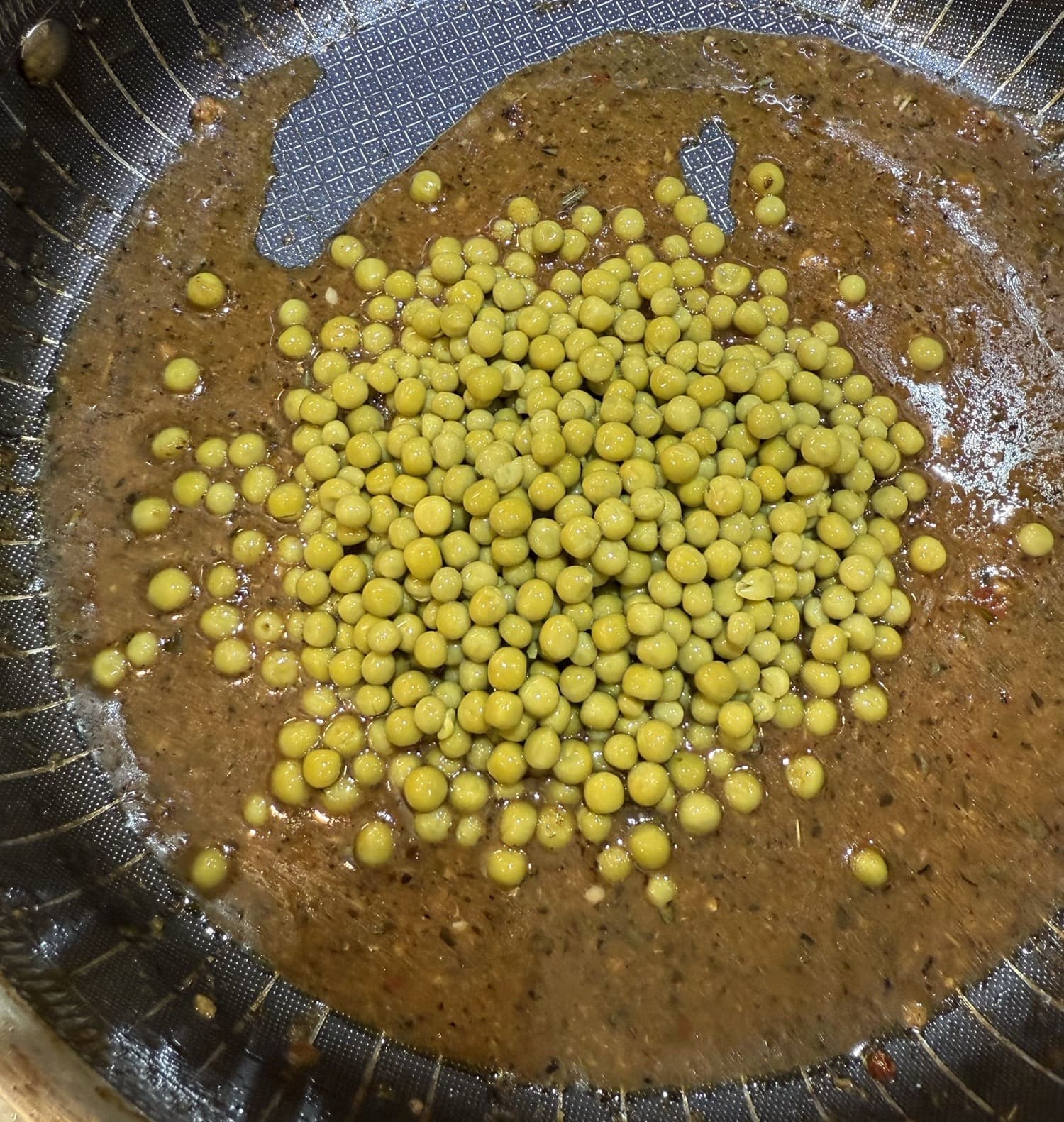 Now, add the peas to the remaining liquid in the pan and let them simmer for about 2-4 minutes or until the peas are cooked and plump.