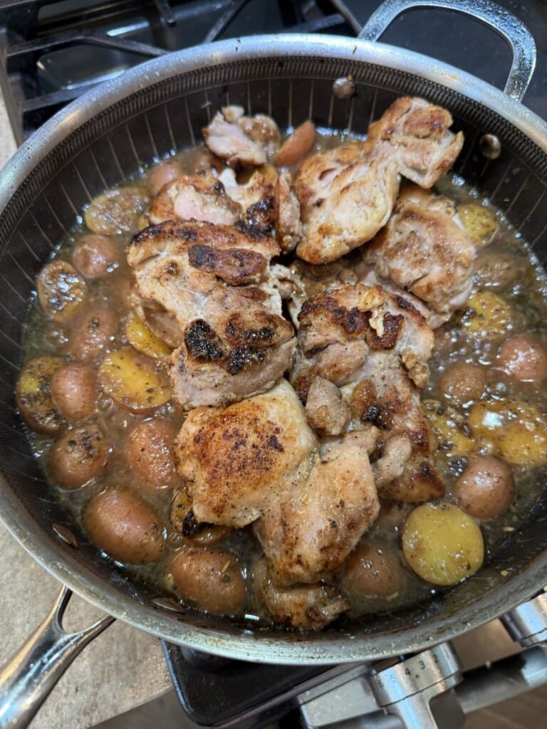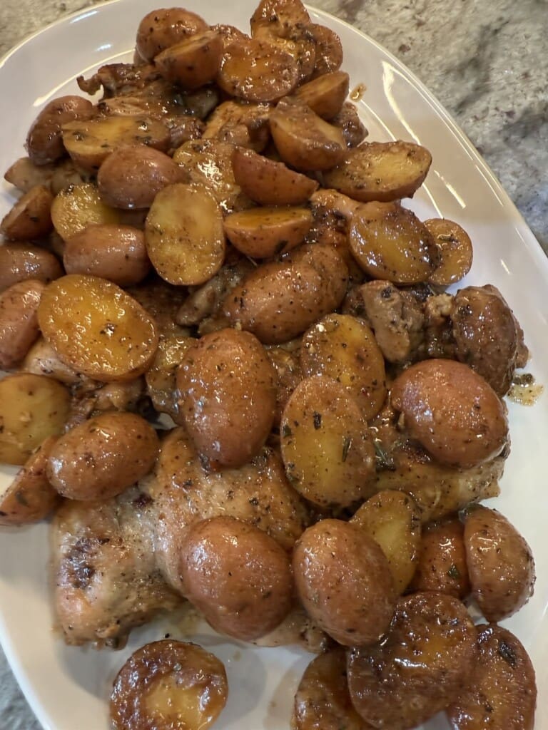 Then, remove the chicken and potatoes from the skillet and add them to a serving dish.