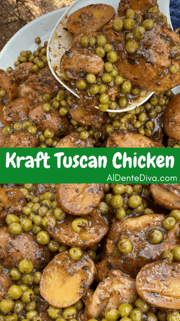 Kraft Tuscan Chicken is made with seasoned chicken thighs and baby potatoes cooked in a flavorful Tuscan Italian dressing based sauce with peas and herbs for a dinner the whole family will love.