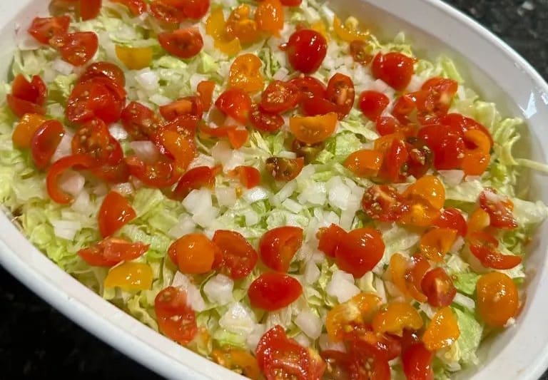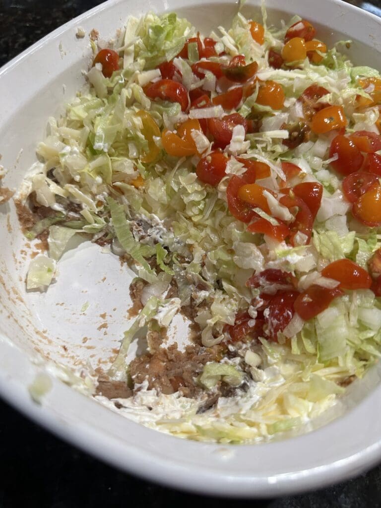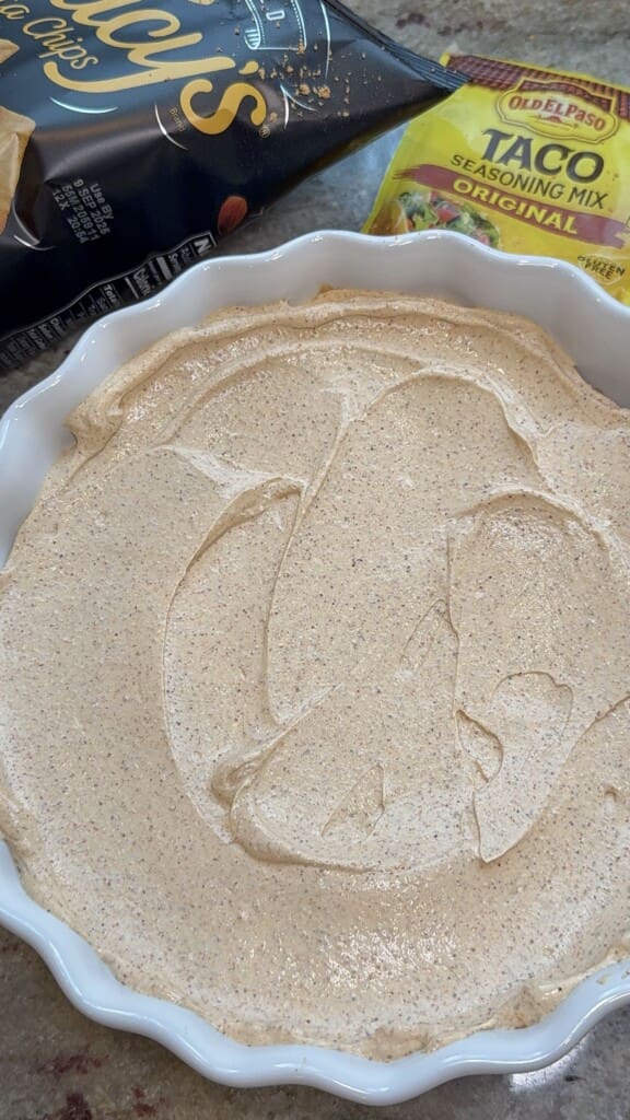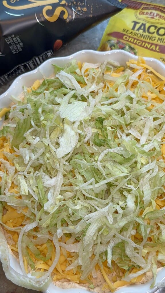 - Mix together the sour cream and taco seasoning packet and add a layer to the top of the beans.