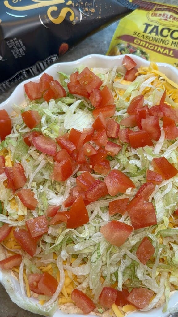 - Add the diced tomatoes to the top and serve with tortilla chips. Enjoy!