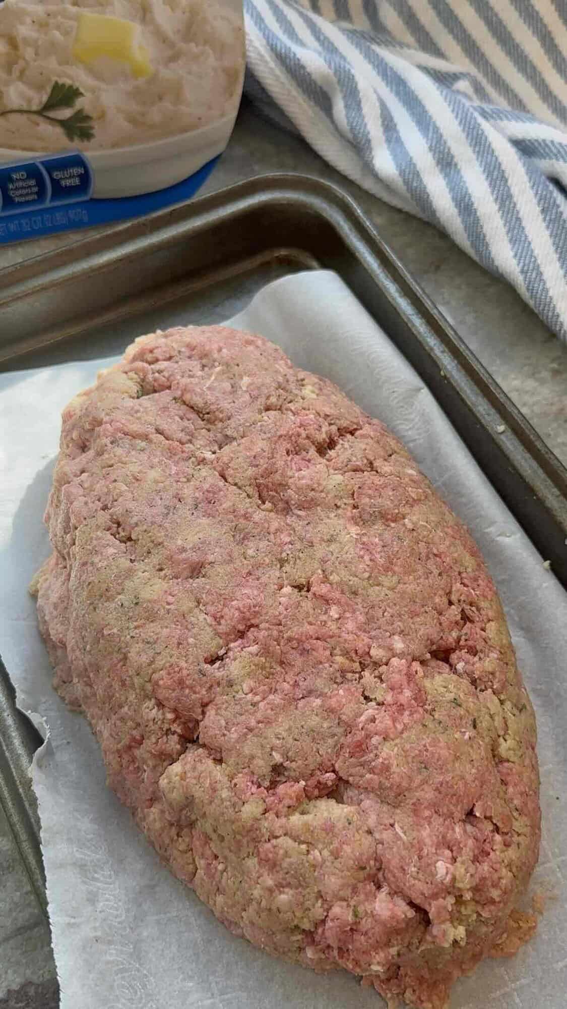 - In a large bowl, combine the ground beef, seasoned breadcrumbs, milk, egg, ketchup, Worcestershire sauce, salt, pepper, and garlic powder. Mix everything together just until combined. Form the mixture into a loaf shape directly on a parchment paper lined baking sheet. Place it on the center rack of the oven for about 30–35 minutes.