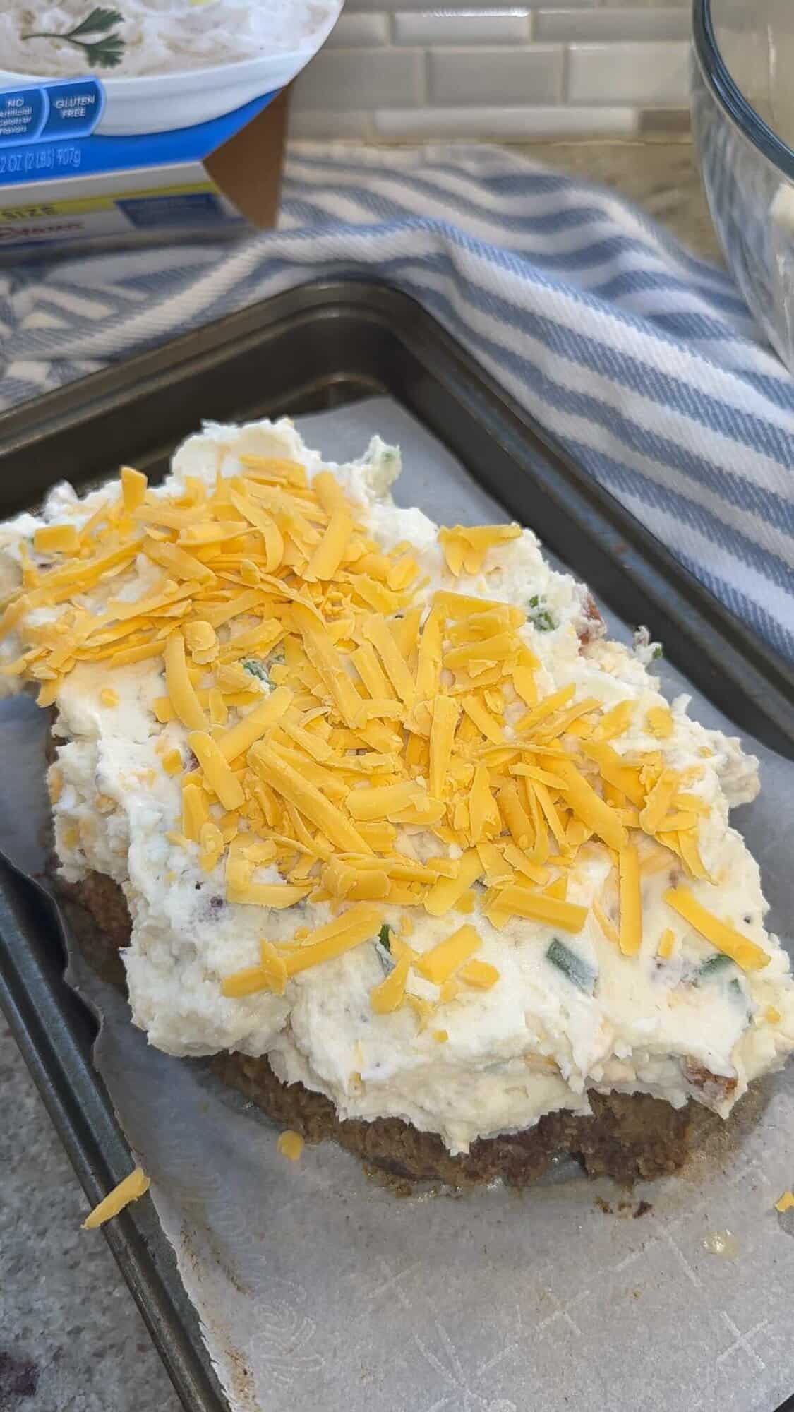 - While the meatloaf is baking, warm the prepared mashed potatoes and add them to a large bowl with the crumbled bacon, sour cream, chives, and ¾ cup shredded cheddar cheese until combined. Remove the meatloaf from the oven and carefully spread the mashed potato mixture evenly over the top. Sprinkle with the rest of the cheddar cheese.