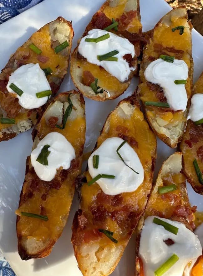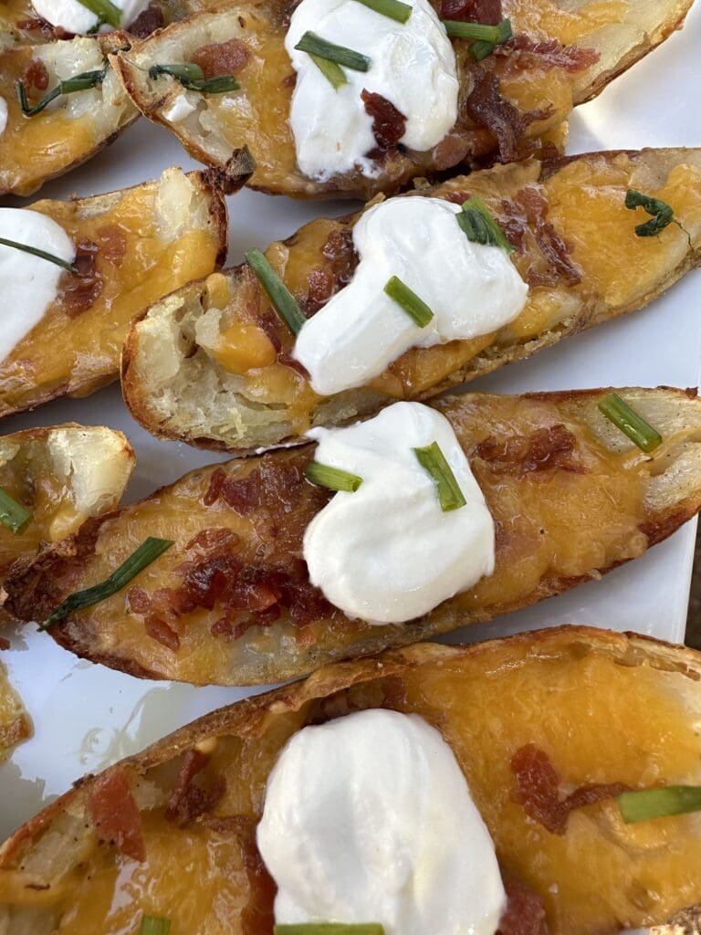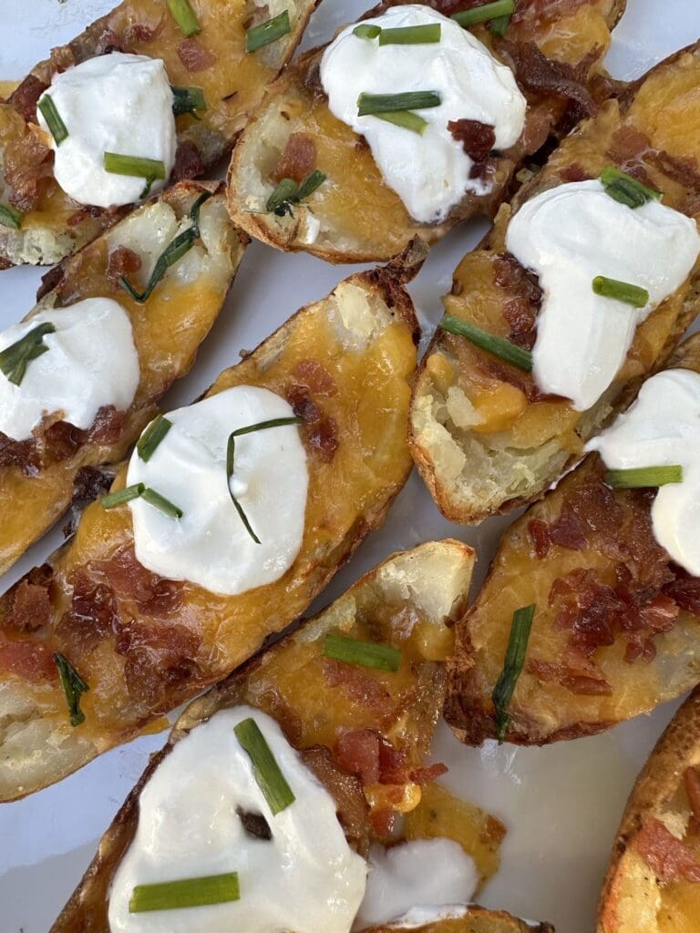 Loaded potato skins are the perfect appetizer for any occasion made with crispy, seasoned potatoes covered in melted cheese, bacon bits, sour cream and chives.