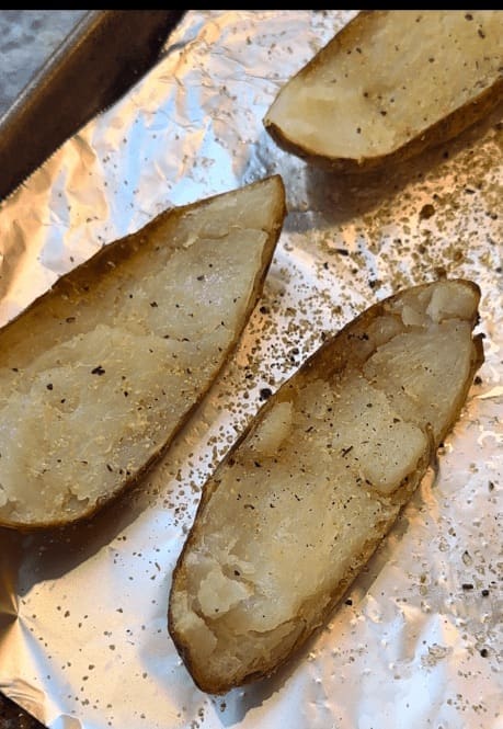 Now, turn the oven off and keep the potatoes on the baking sheet. Sprinkle the inside with pepper and garlic powder.