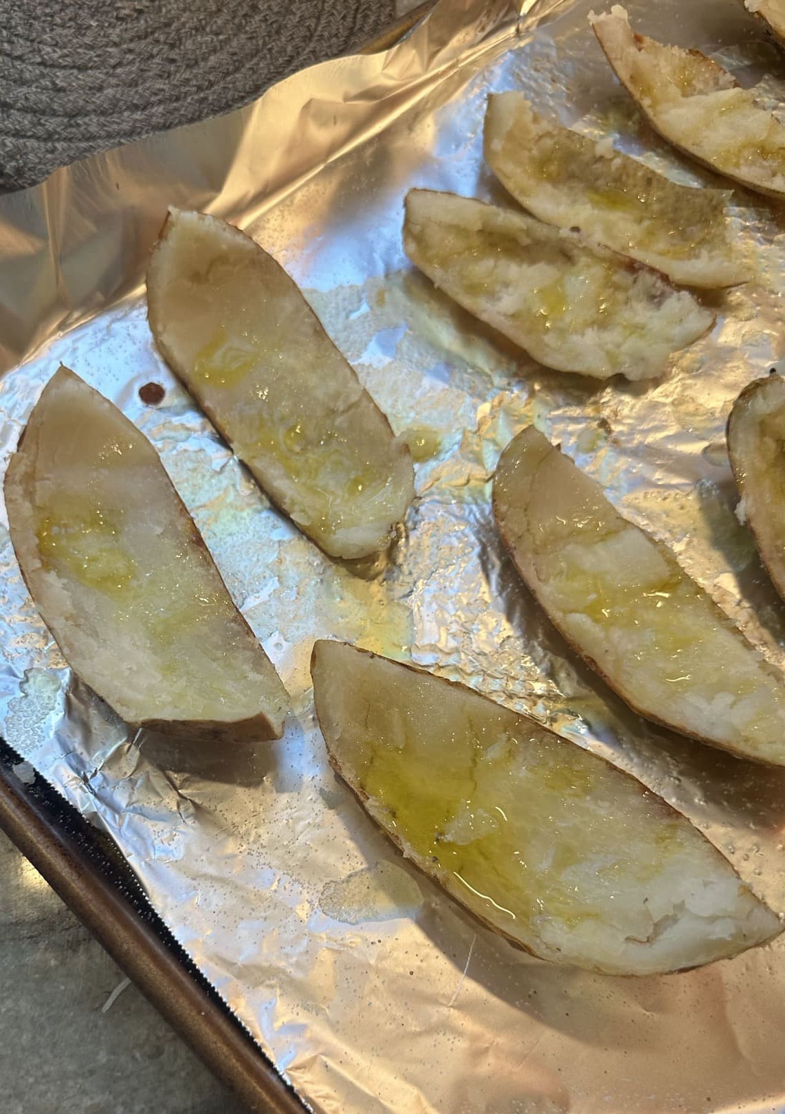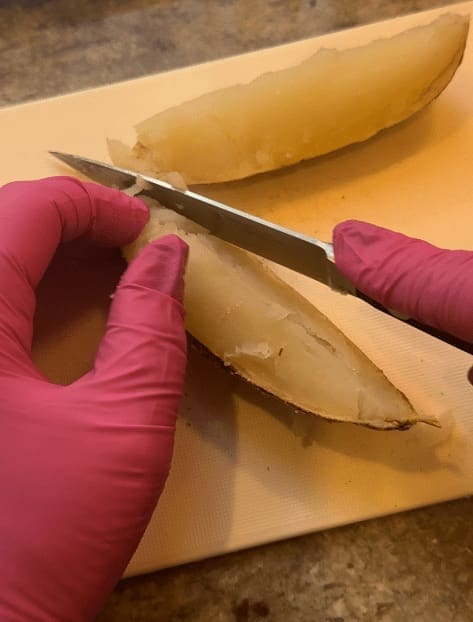 - Remove the potatoes and let them cool slightly. Next, cut the potatoes once (lengthwise) then once more. Cutting the potato into four pieces total.