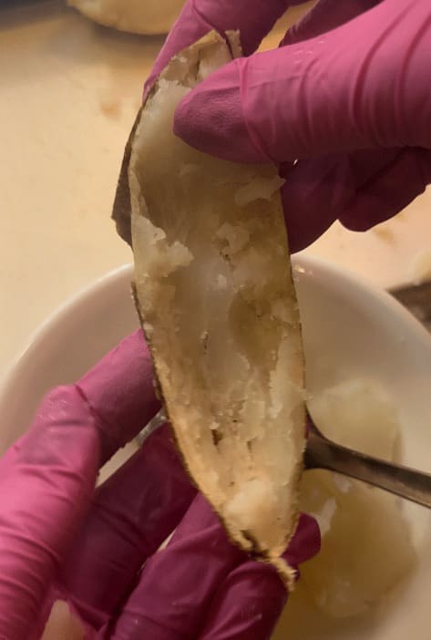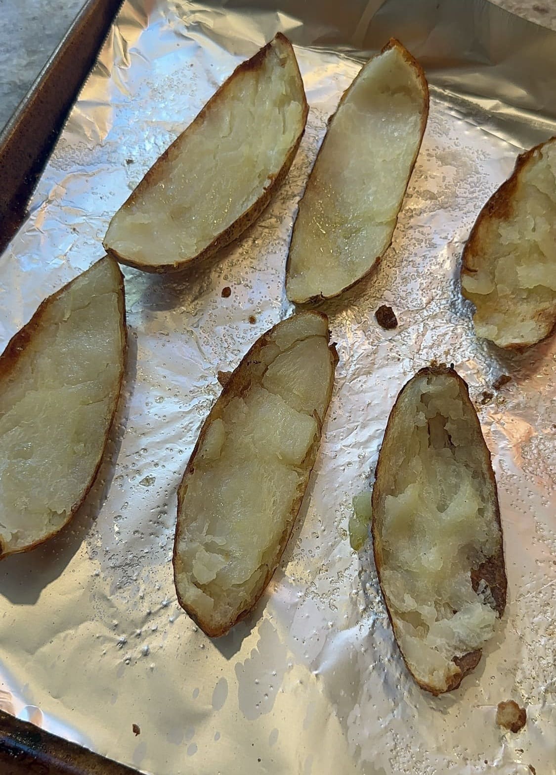 - Using a spoon, remove most of the potatoes filling leaving only a little bit close to the skin.