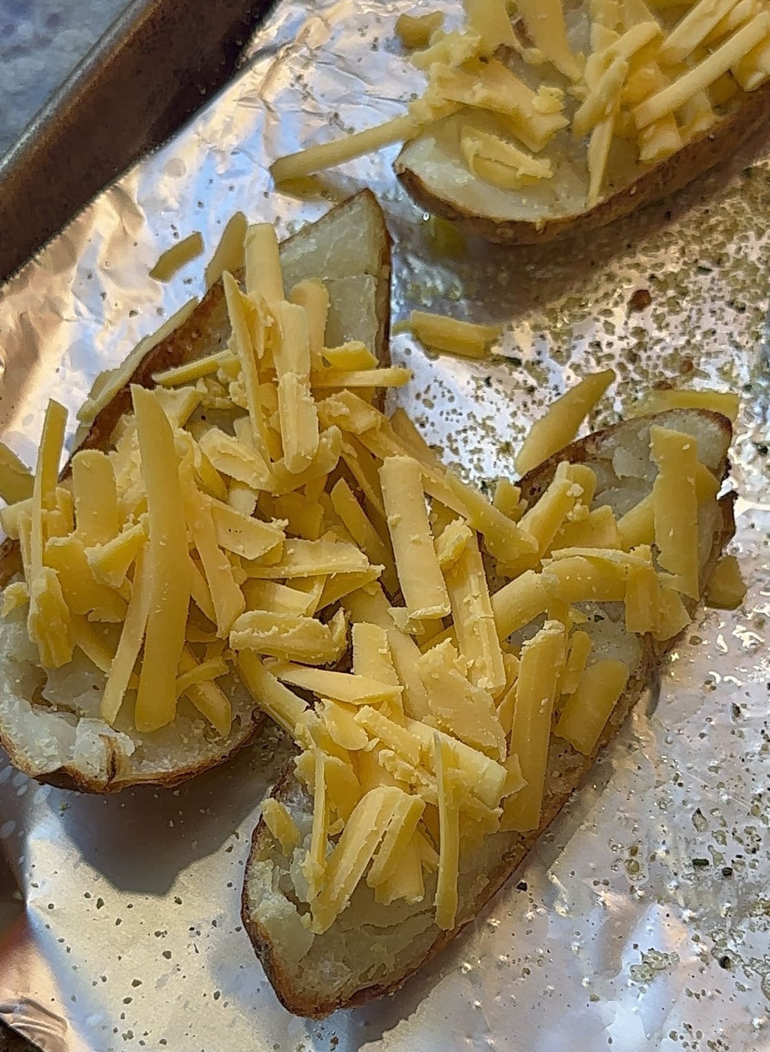 - Evenly distribute the shredded cheese onto each of them and sprinkle them with the bacon bits.