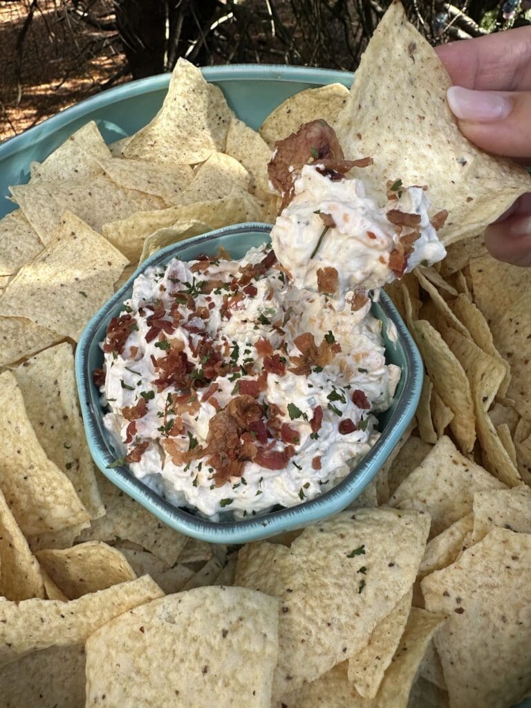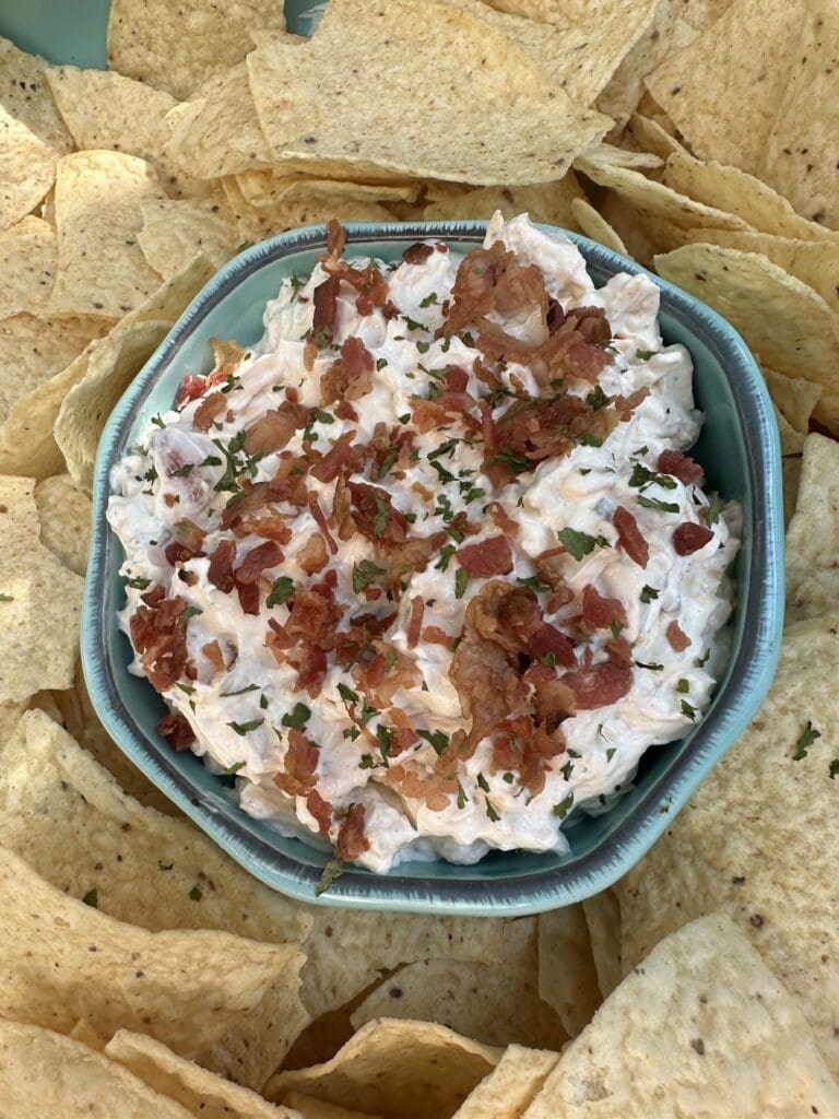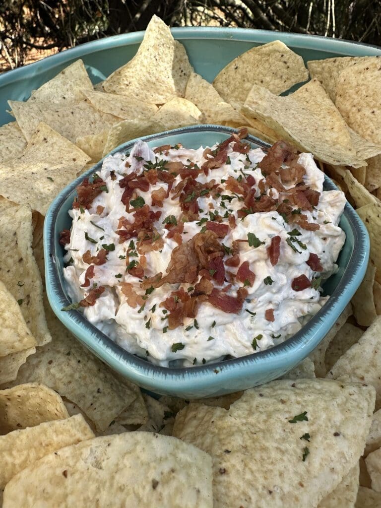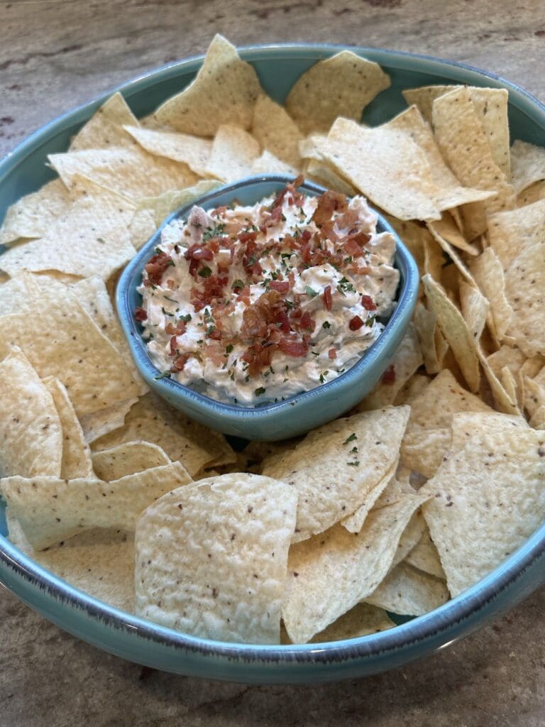- Finally, give it one big stir and garnish with more bacon bits and chives. Serve with tortilla chips. Enjoy!