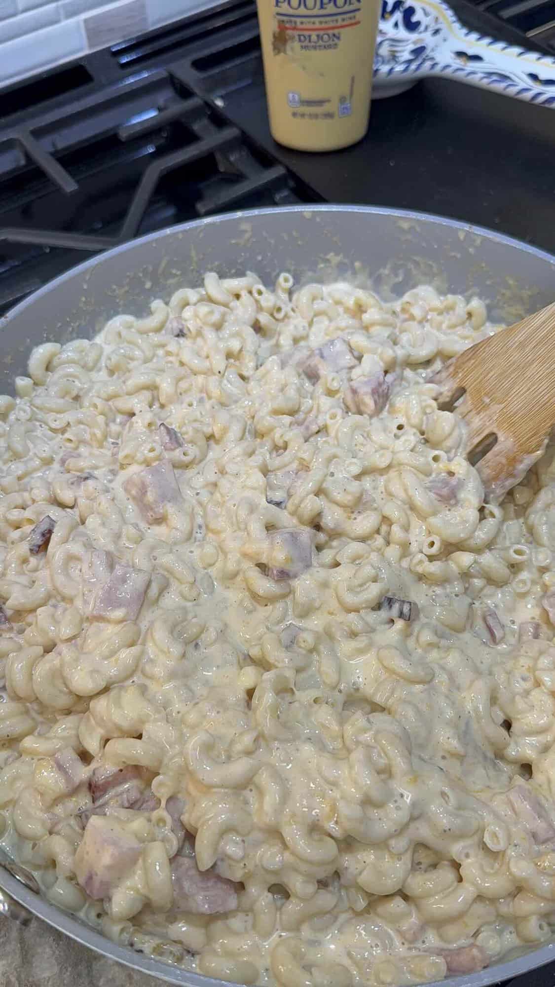 - In the same pot, melt the butter over medium heat. Slowly pour in the heavy cream and season with garlic powder, onion powder, paprika, salt, pepper, and Dijon mustard. Stir to combine and lower the heat. Gradually stir in 2 cups of cheddar cheese until it’s melted into the sauce. Stir in the diced ham and macaroni until it’s evenly coated in the cheese sauce.