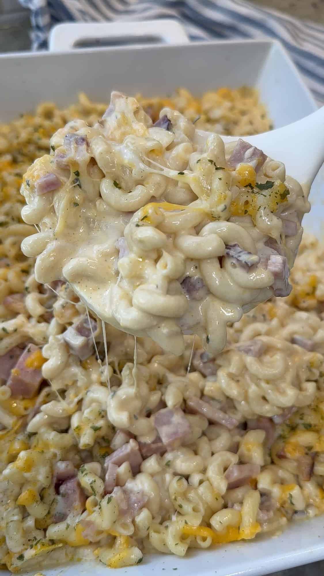 First, bring a large pot of salted water to a boil and cook the macaroni according to the directions on the package. Before draining, reserve ½ cup of pasta water (if needed later), then drain the pasta and set it aside. In the same pot, melt the butter over medium heat. Slowly pour in the heavy cream and season with garlic powder, onion powder, paprika, salt, pepper, and Dijon mustard. Stir to combine and lower the heat. Gradually stir in the cheddar cheese until it’s melted into the sauce. Stir in the diced ham and macaroni until it’s evenly coated in the cheese sauce.