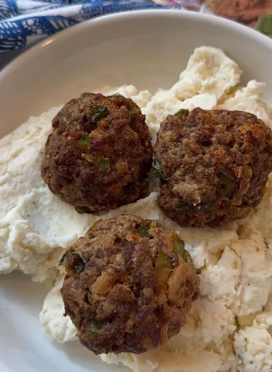 - Then, once the meatballs are done cooking, place them on top of some mashed potatoes.