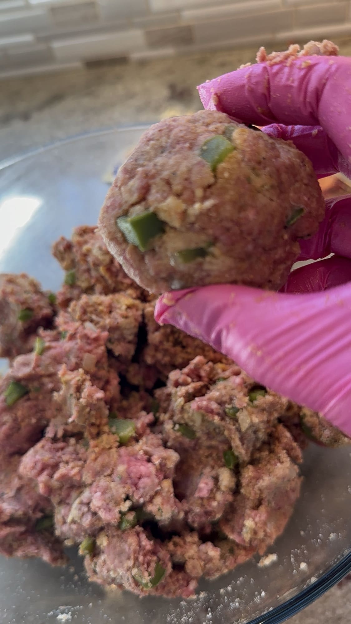 Now, take a small handful of the meatloaf mixture and roll them into 1-2” balls.