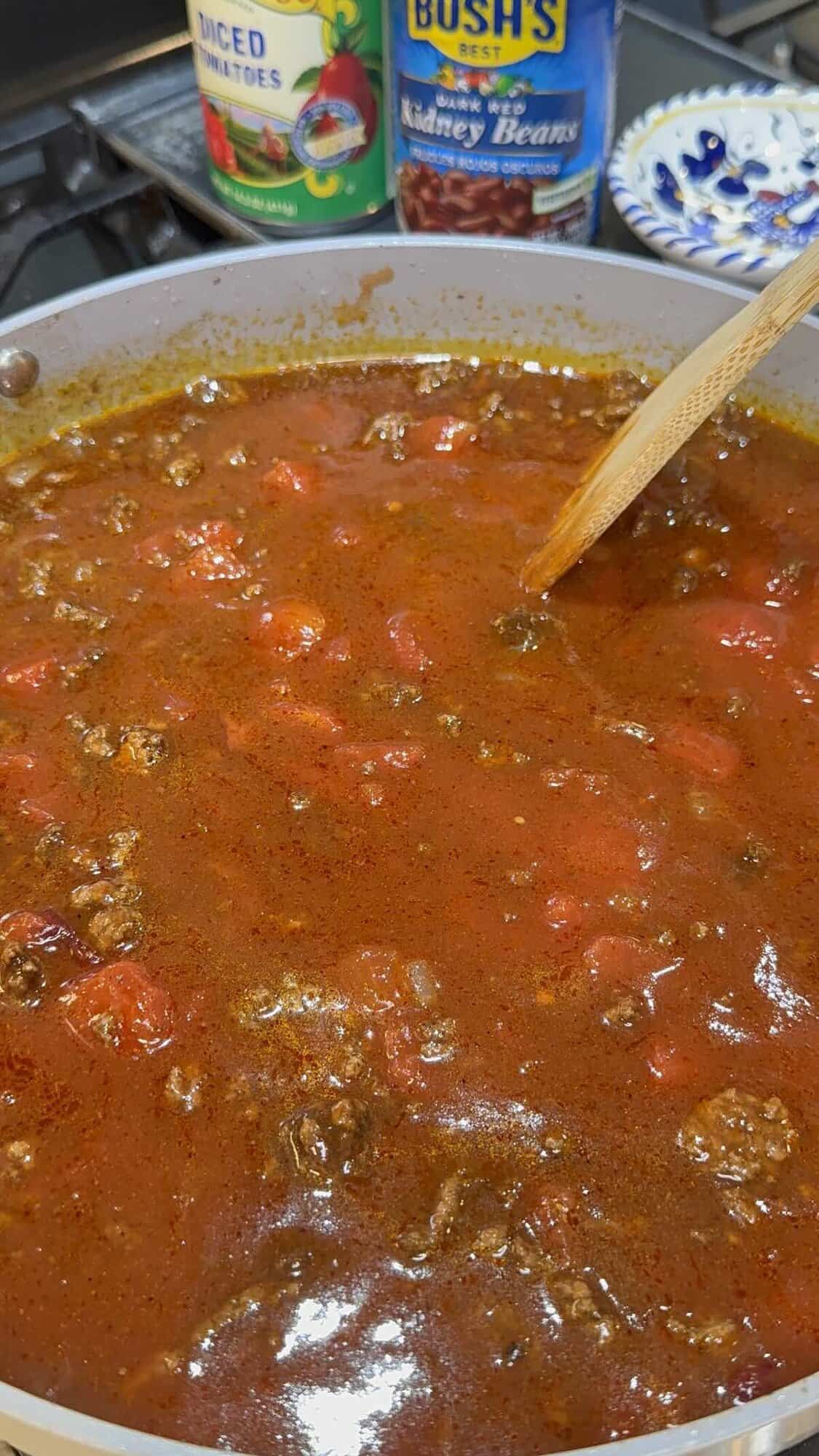 First, In a large skillet, brown the ground beef with the onion until fully cooked, then add garlic and chili seasoning. Stir in tomato sauce, beans, diced tomatoes, and beef broth. Bring to a simmer.