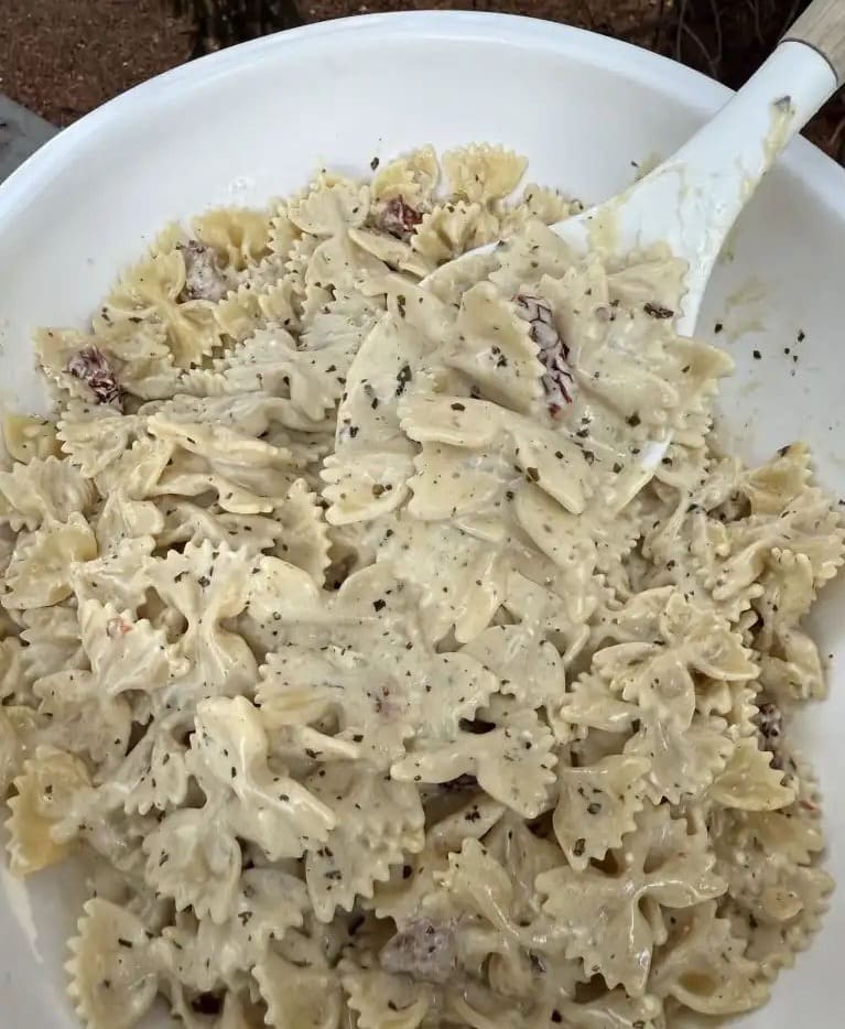 - Stir in a ladle of pasta water and the cooked farfalle pasta.