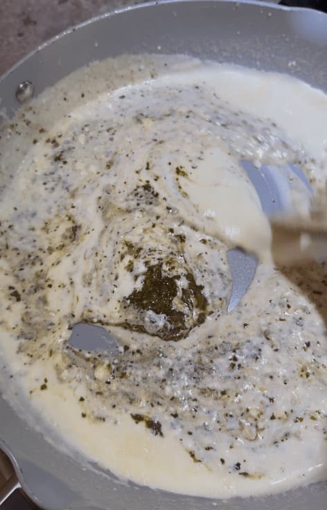 Next, season the sauce with salt, pepper and garlic powder and stir in pesto.