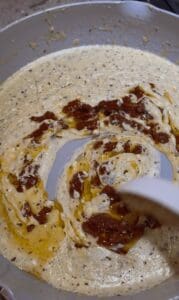 Now, stir in the chopped sun dried tomatoes and a splash of the oil from the jar that they came in.