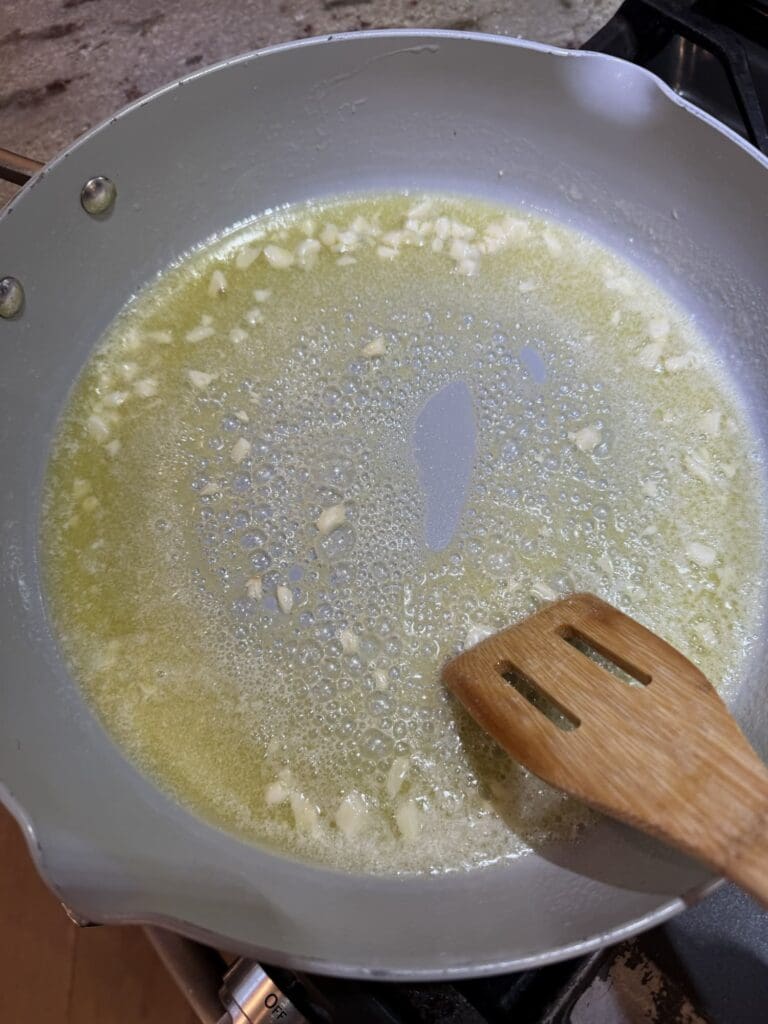 - In a large skillet, melt the butter over medium high heat and stir in the crushed garlic. Let that simmer for about 1-2 minutes.