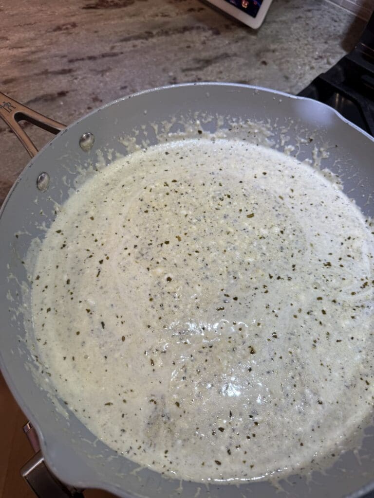 - Season the sauce with salt, pepper and garlic powder and stir in pesto. Then, add the Parmesan cheese and stir the sauce until the cheese is melted and well blended into the sauce.
