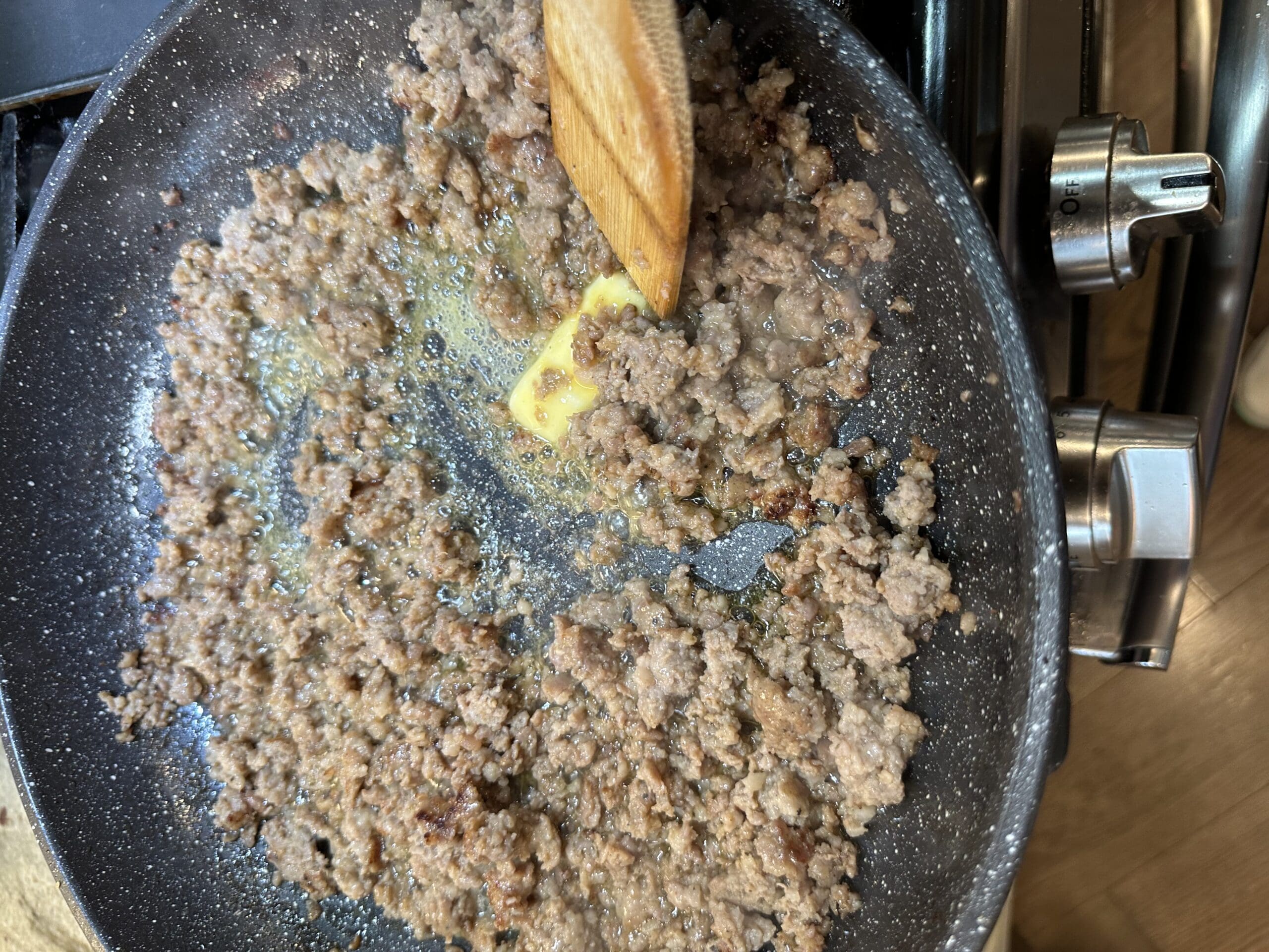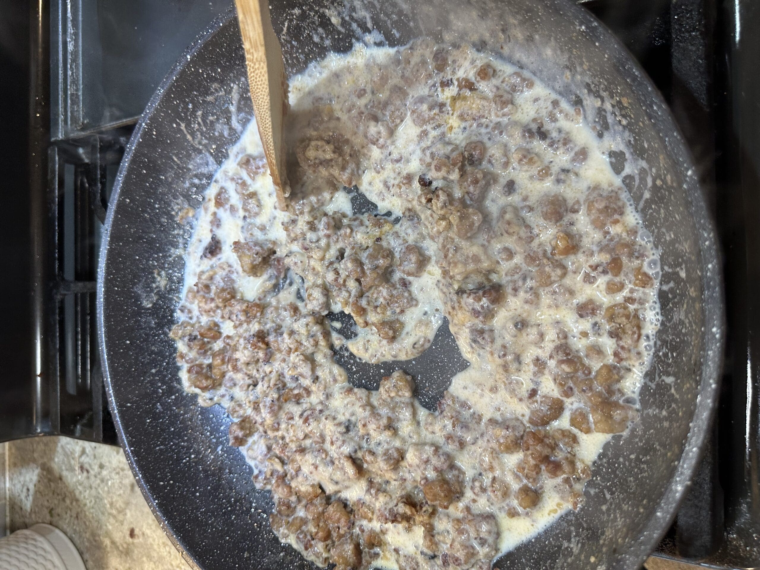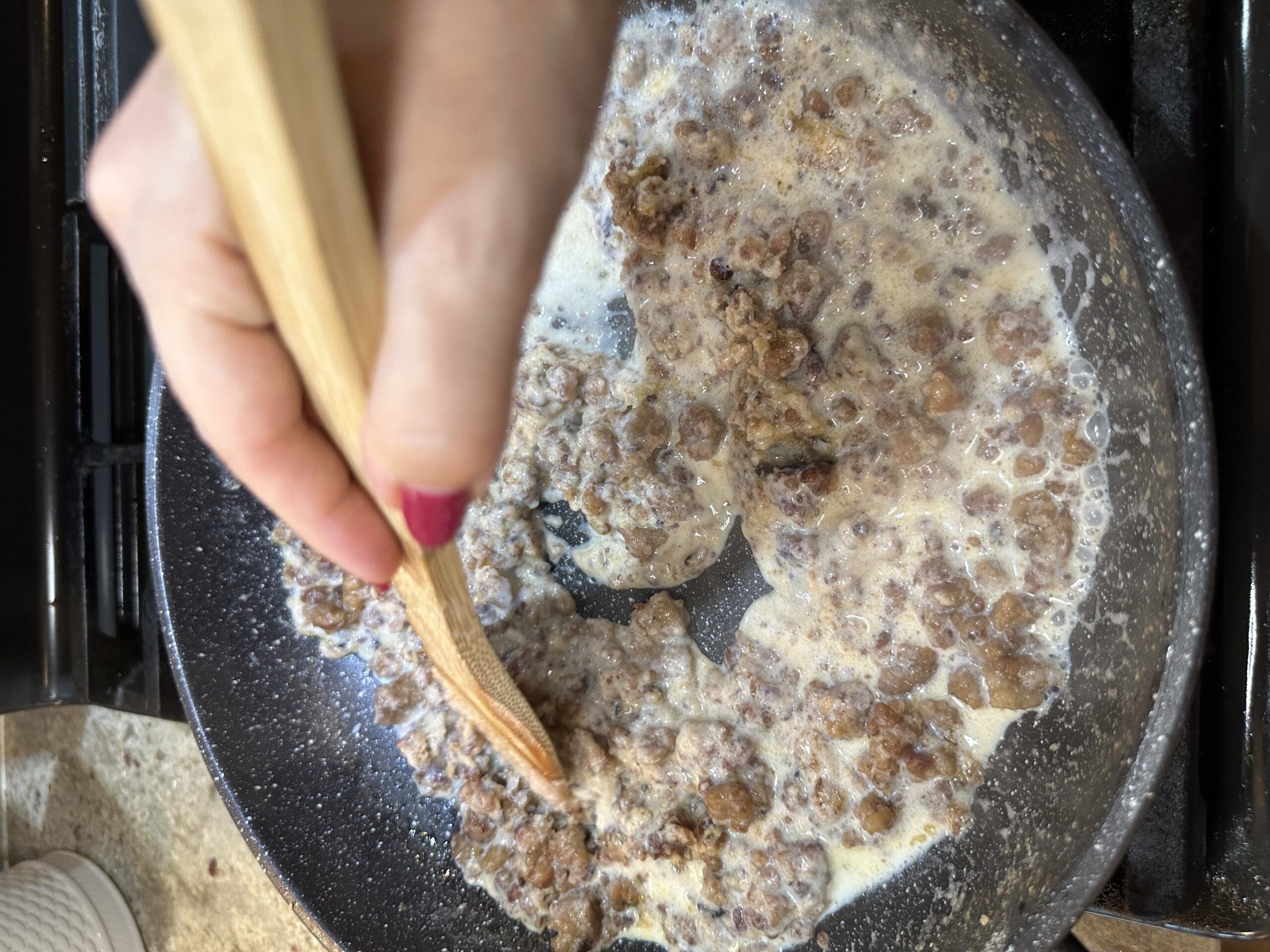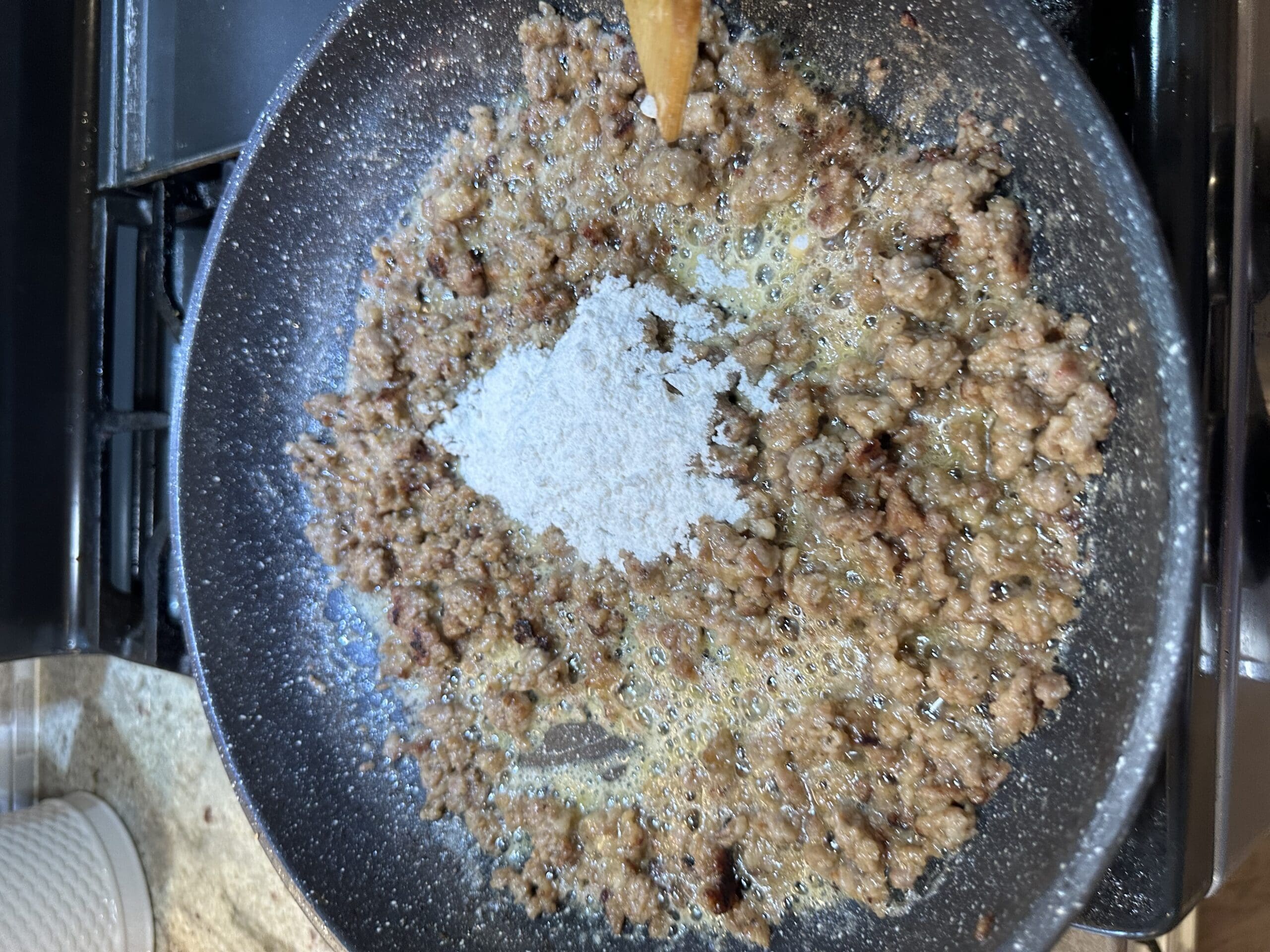 - now slowly add in the flour and stir it into the sausage. Cook it for about 3 minutes to remove the strong flour taste.