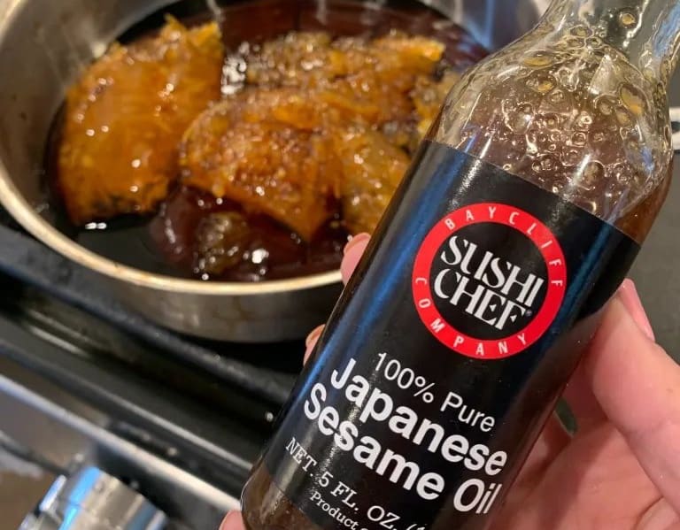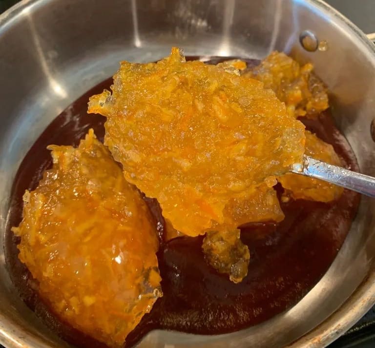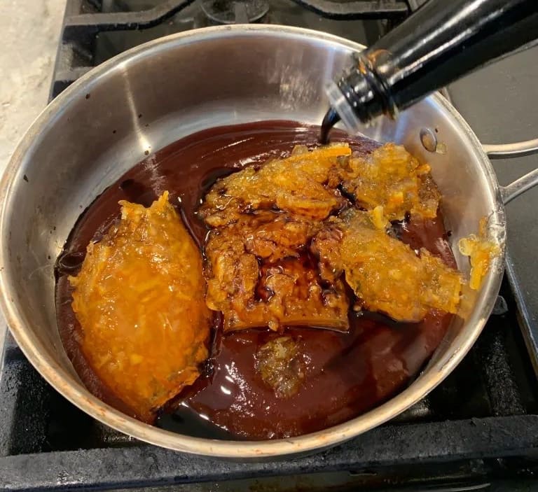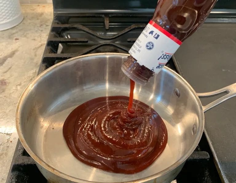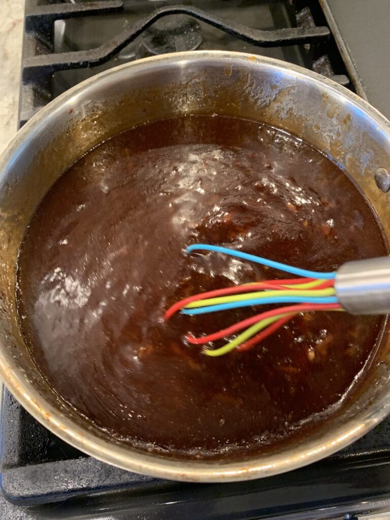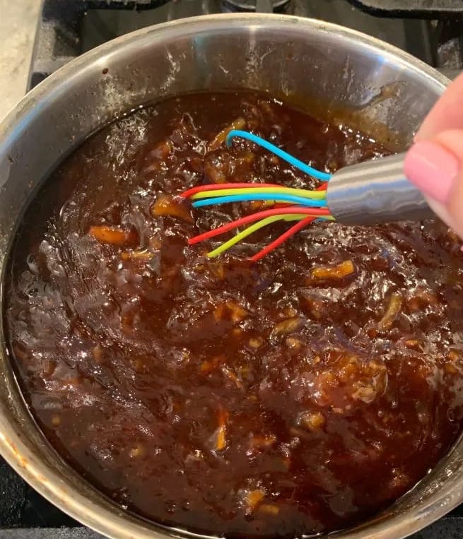 - while thats cooking, add the bbq sauce, marmalade, soy sauce and sesame oil (if you're using it) to a small sauce pan.