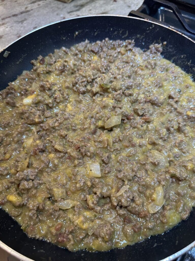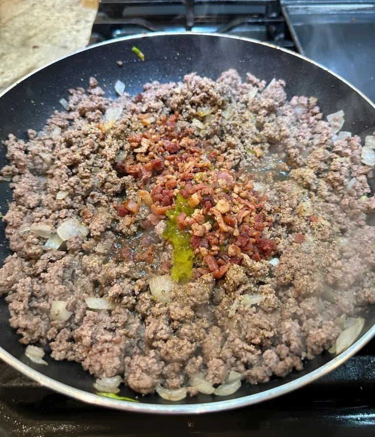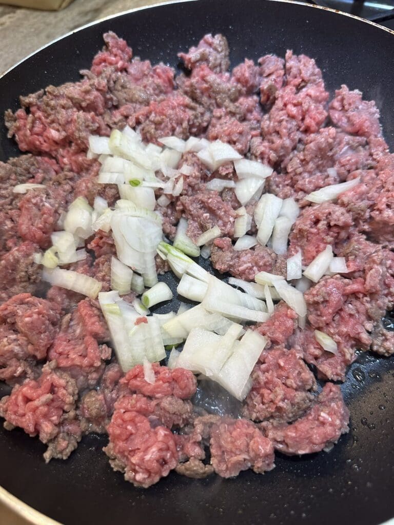 - First, cook the ground beef and chopped onion together medium high heat breaking the beef it into small pieces as it browns.