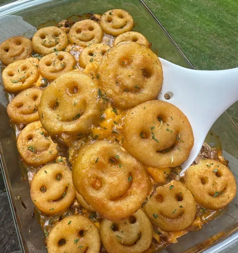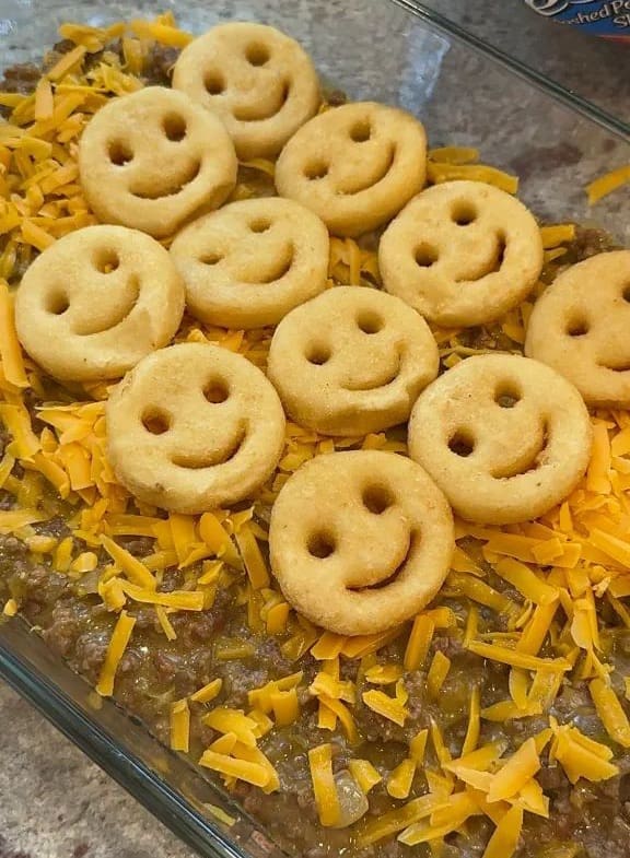 This smiley fry bacon cheeseburger casserole is a super interesting, really delicious and very easy to out put together dinner idea.