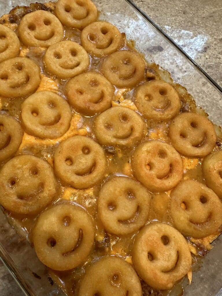 Then, place the smiley fries down side by side until they cover the whole top of the casserole.