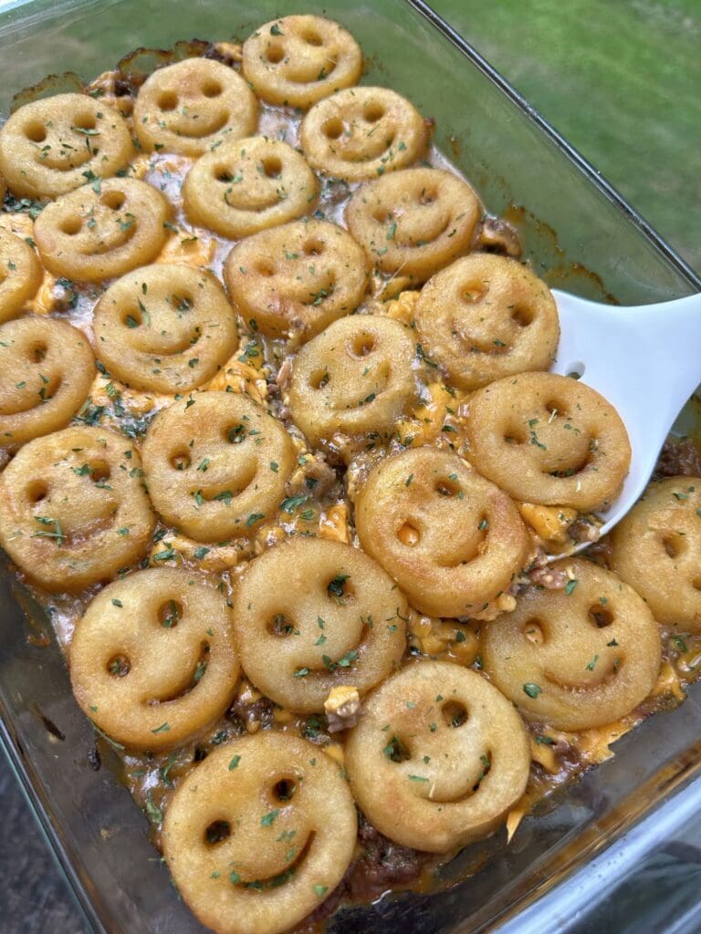 This smiley fry bacon cheeseburger casserole is a super fun play on a cheeseburger and fries using bacon bits, cheesy seasoned ground beef and smile fries that the whole family will love.