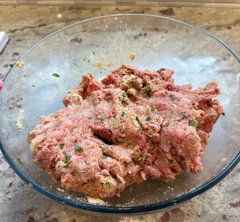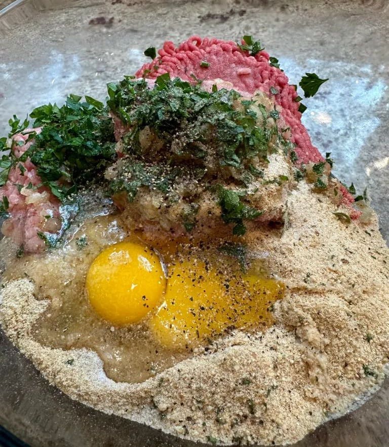 - In a large bowl, add the ground beef, pork, eggs, breadcrumbs, milk onion, parsley, salt, pepper and half of the garlic powder.