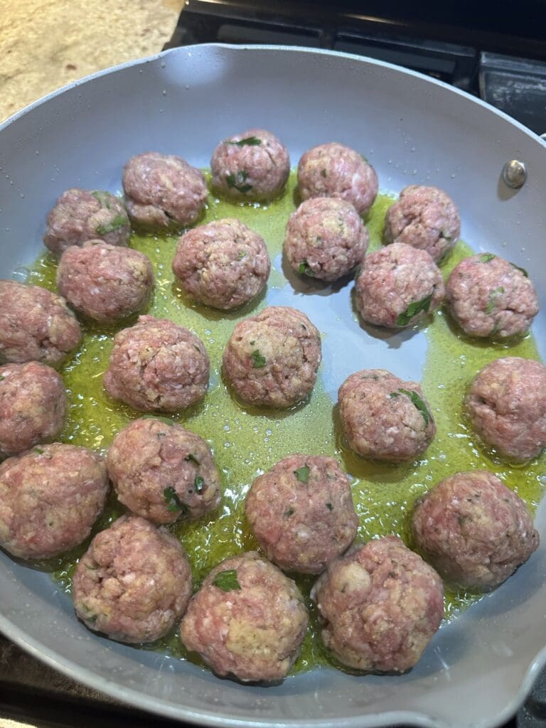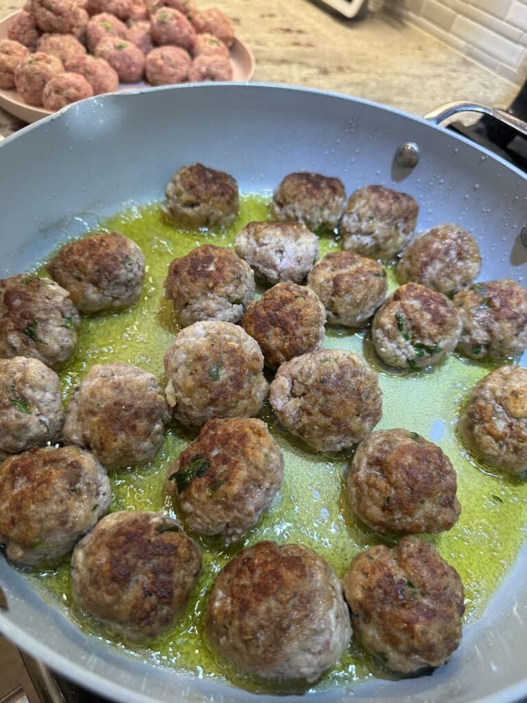 Now, working in batches, pan fry the meatballs on all sides until they are golden brown.