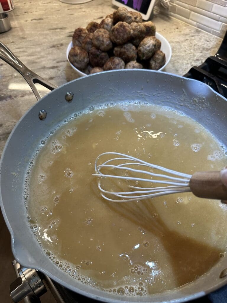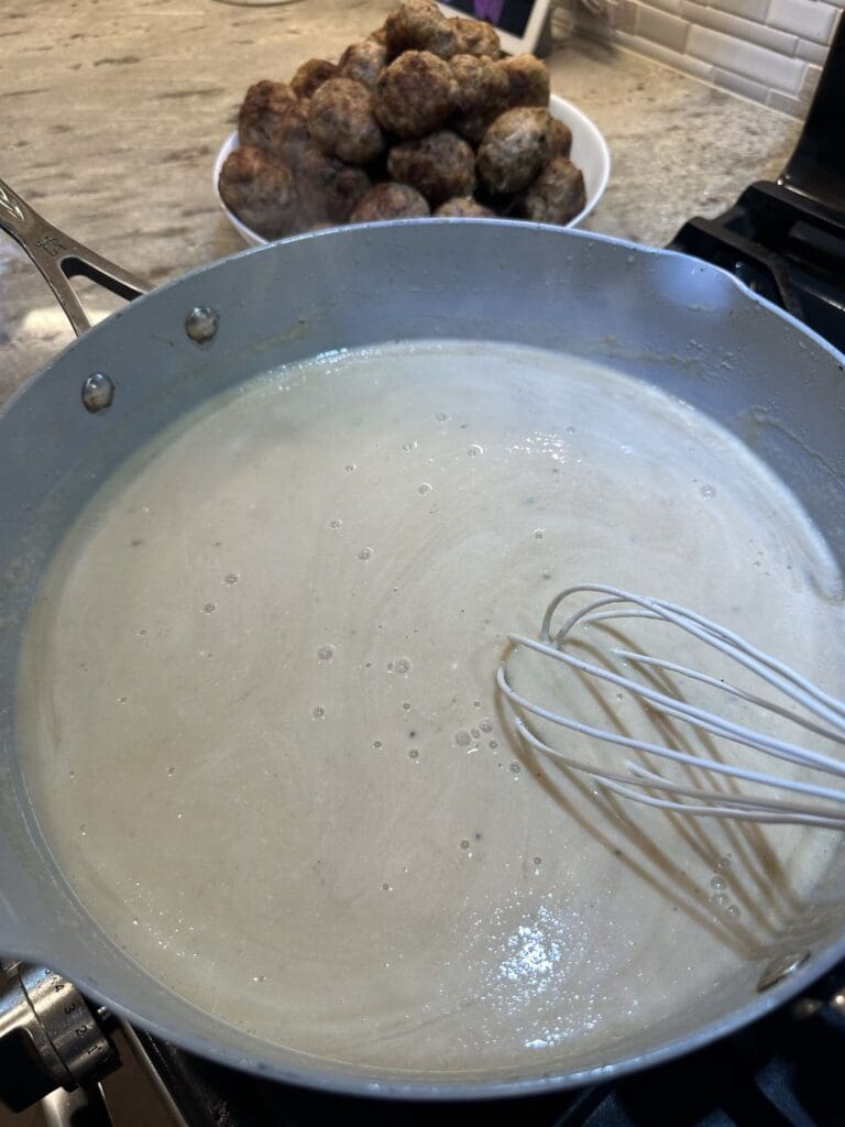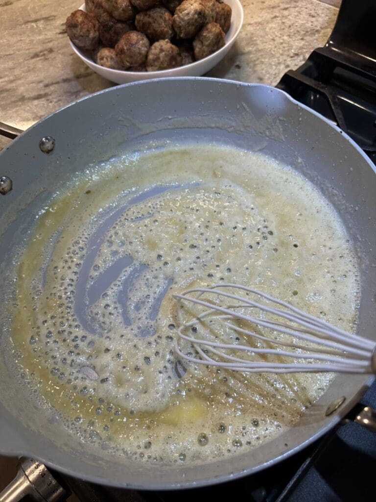 - Add the butter and flour to the same pan that you fried the meatballs in and whisk them together for about 3 minutes.