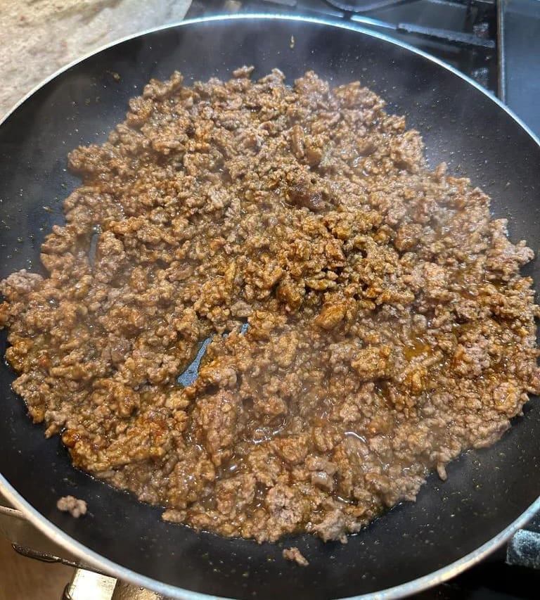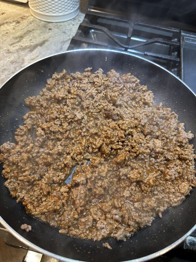 - First, make the ground beef according to the directions on the taco seasoning packets and set it aside. You’re going to use 2 packets for one pound of beef for extra flavor.