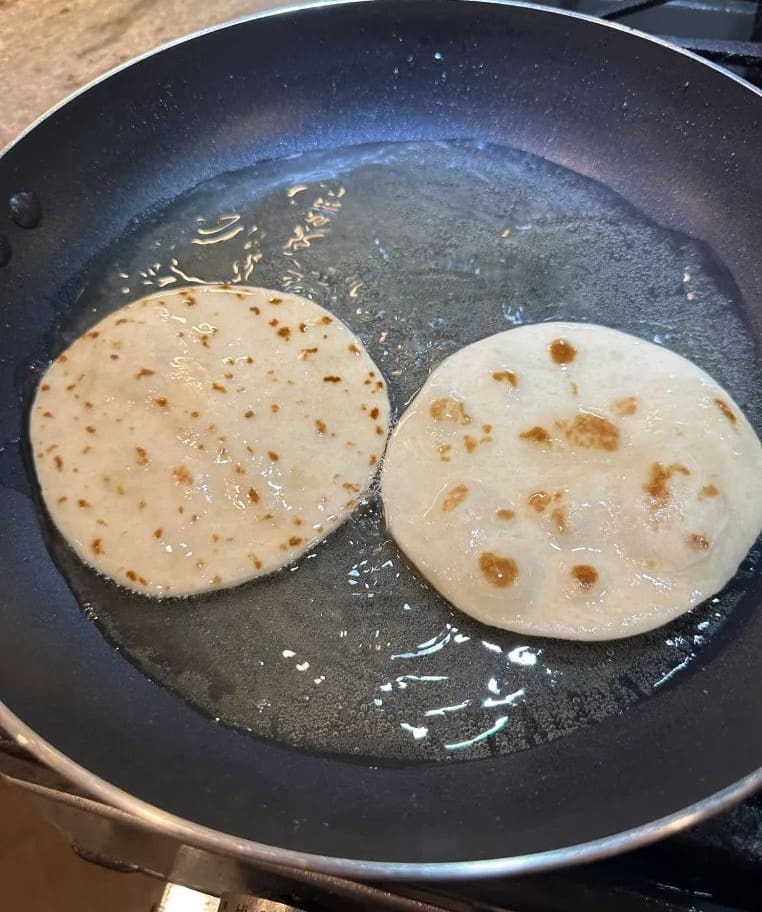 Now, heat the oil in a large skillet and fry the tortillas on both sides until they’re lightly crisped and golden brown.