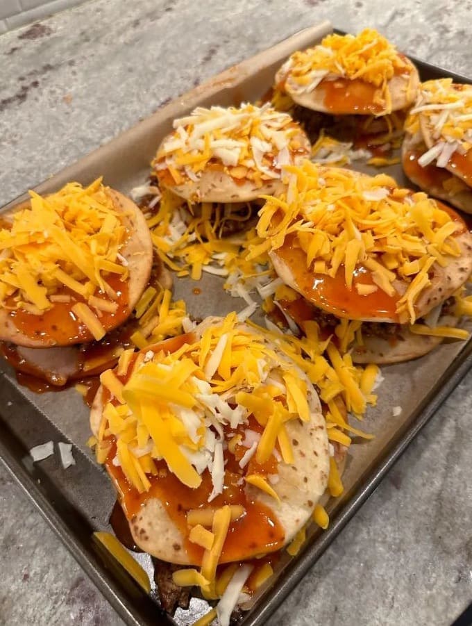 - Then top that with another tortilla, the rest of the enchilada sauce and shredded cheeses.
