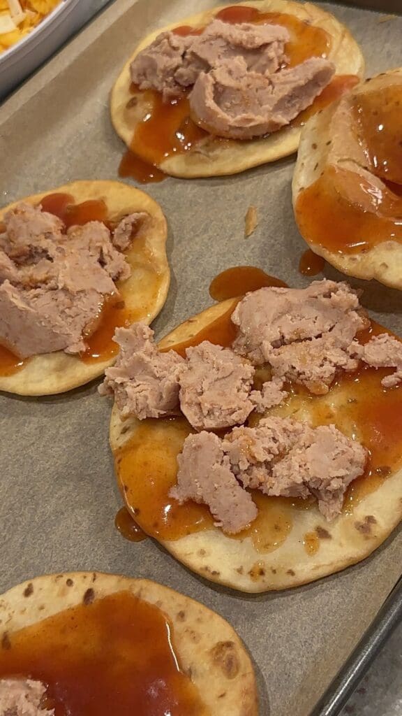 Next, put some enchilada sauce down and spread a little of the refried beans onto the top of the sauce.