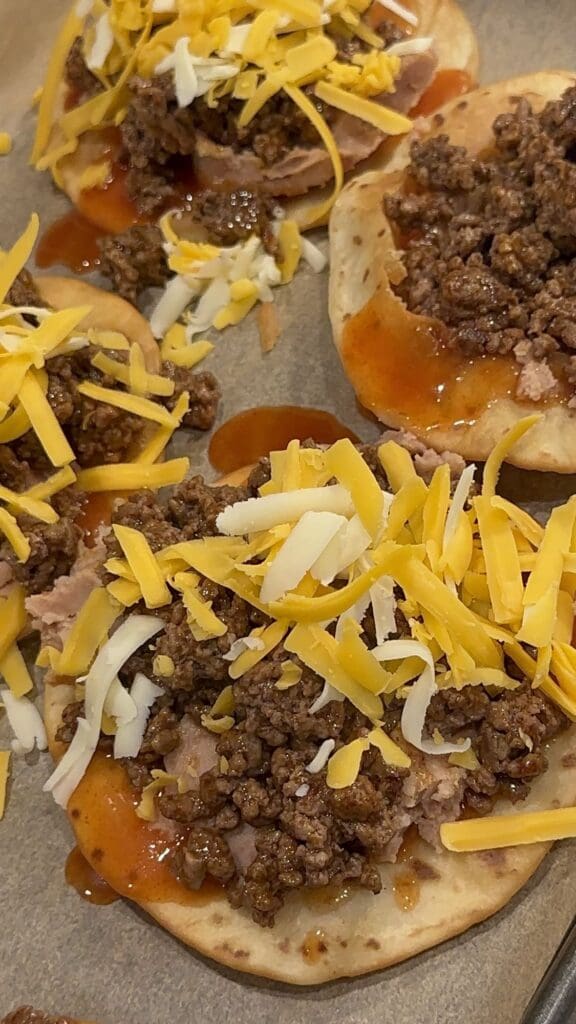 Now, add the ground beef evenly on top of the refried beans followed by the half of the shredded cheeses.