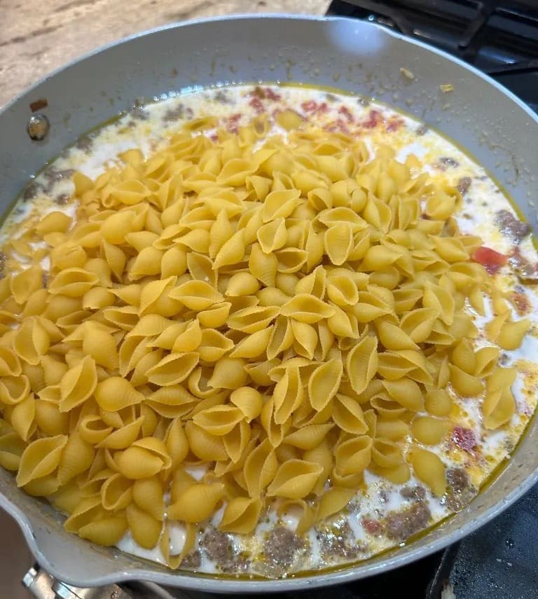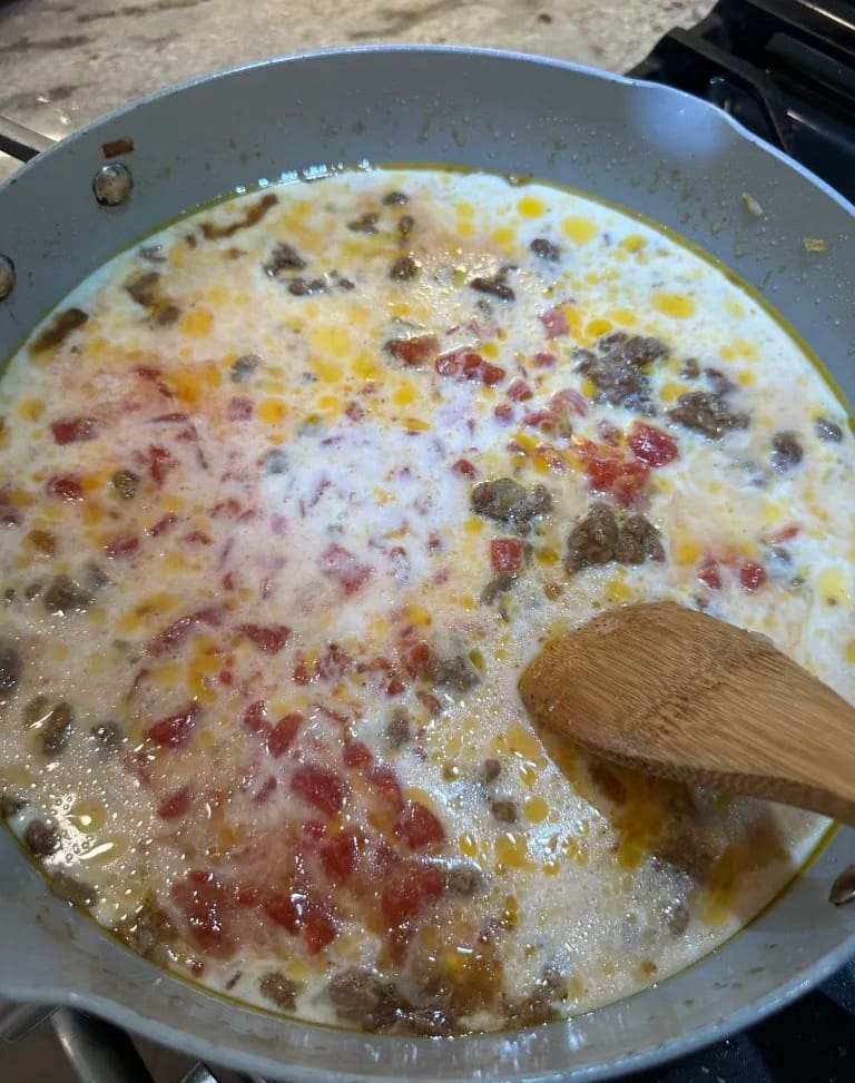 - Add the can of Rotel, beef broth, and milk. Stir everything together and add the uncooked pasta.