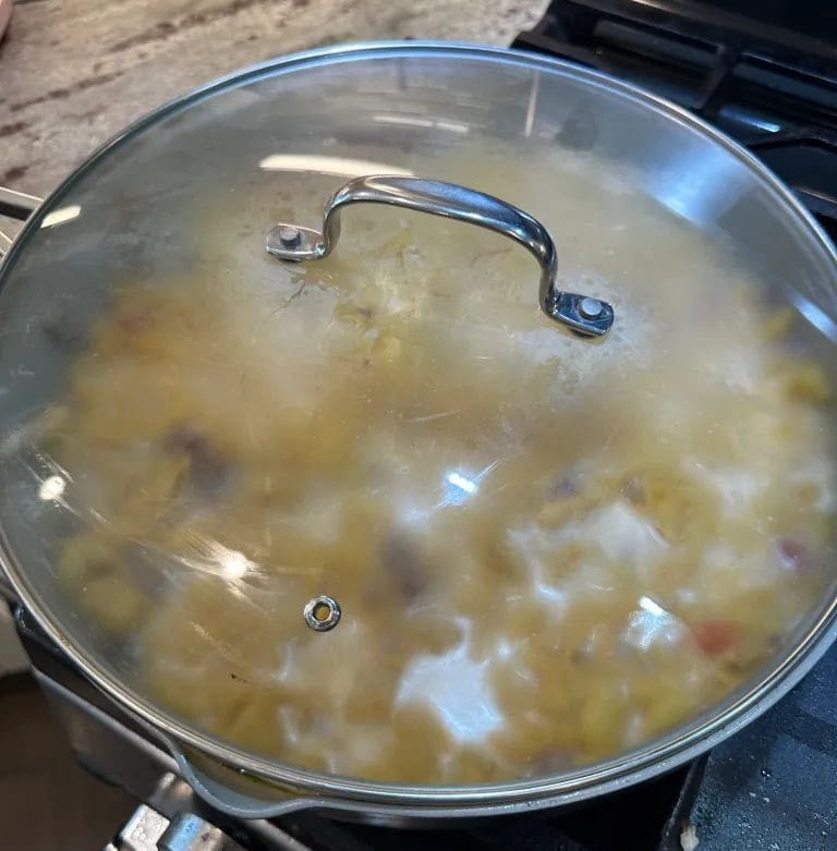 Now, place a lid on top of the skillet and let the pasta simmer for about 15 minutes or until the pasta is cooked, stirring half way through.